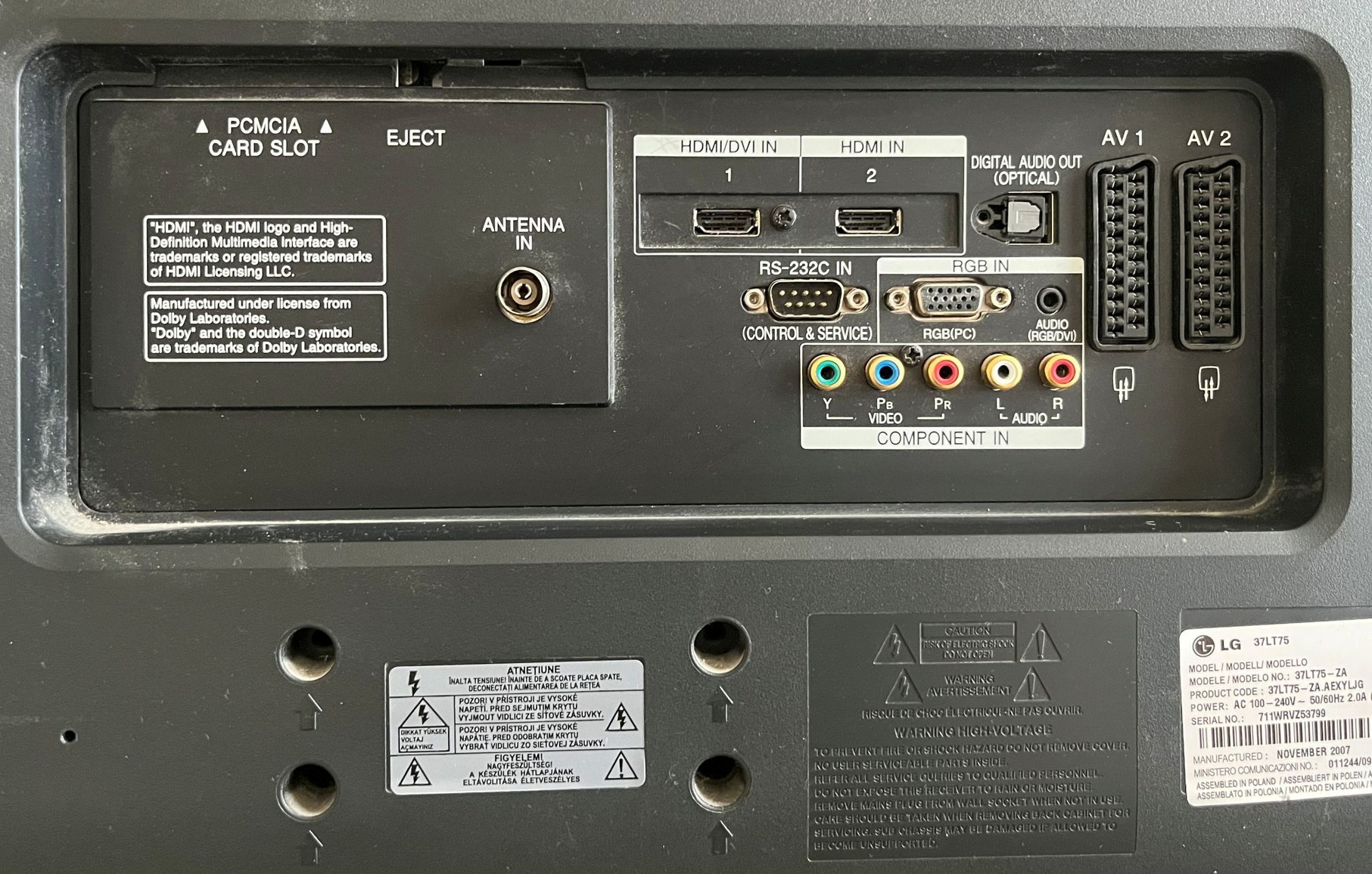 JellemzőAdatKépernyő37″ (≈94 cm), HD Ready (1366 × 768)PanelLGPL S‑IPS, fényerő 500 cd/m², 6 msKontrasztarány8 000:1 (dinamikus)HDD160 GB (max. 57 óra HD felvétel)Tunerek2× DVB‑T digitális + analóg tunerHDMI2 portSCART2 portEgyéb bemenetek/kimenetekRGB, PC audio, komponens, S‑Video, optikaiHang2×10 W, surround, Dolby DigitalEnergiafogyasztás~126–200 W működés, ~1 W standbySúly~17,6 kg (állvány nélkül), kb. 21 kg állvánnyalMéretek (Á×Sz×M)934 × 679 × 281 m
