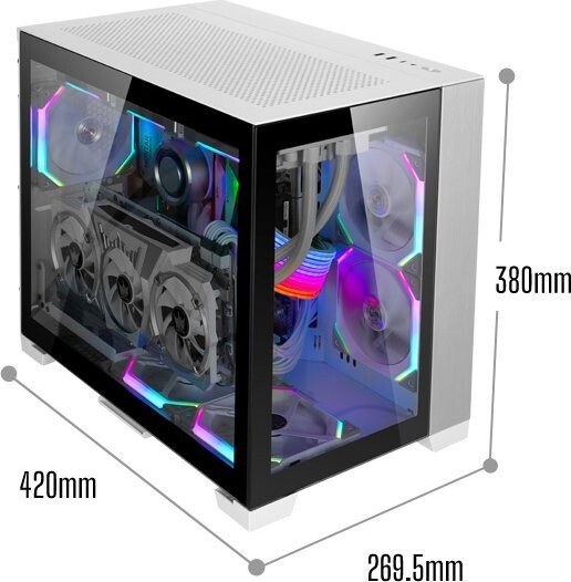 Műszaki információk: Méretek: 269,5 x 380 x 420 mm (Sz x Ma x Mé) Anyaga: acél (belső), alumínium, edzett üveg Súly: 8,5 kg Szín: fehér, ezüst, fekete Formatényező: ATX, Micro-ATX, Mini-ITX Lehetséges ventilátorok száma: