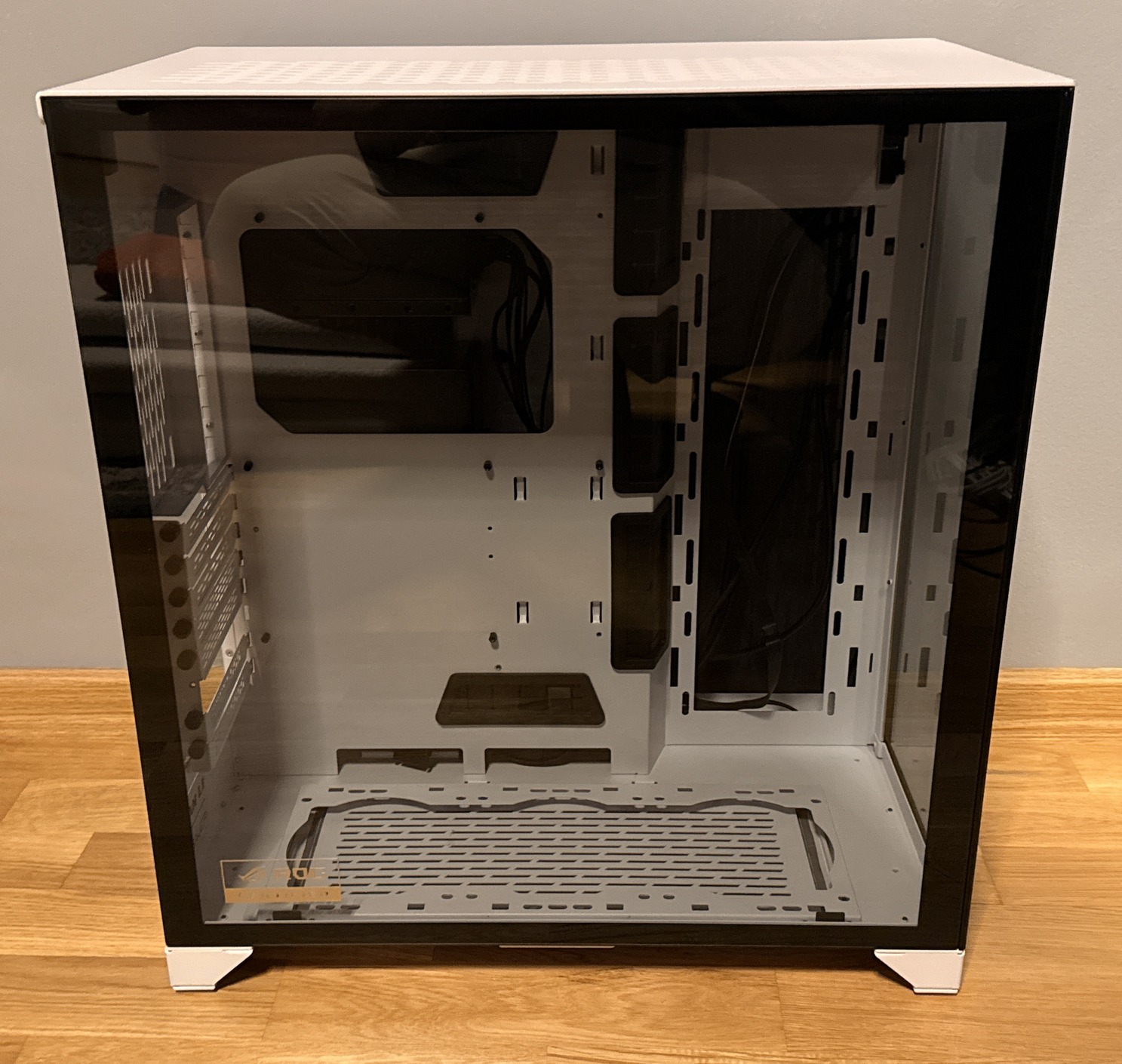 Eladó a képeken látható Lian Li PC-O11 Dynamic (ROG Edition) típusú prémium, fehér színű gépház.
