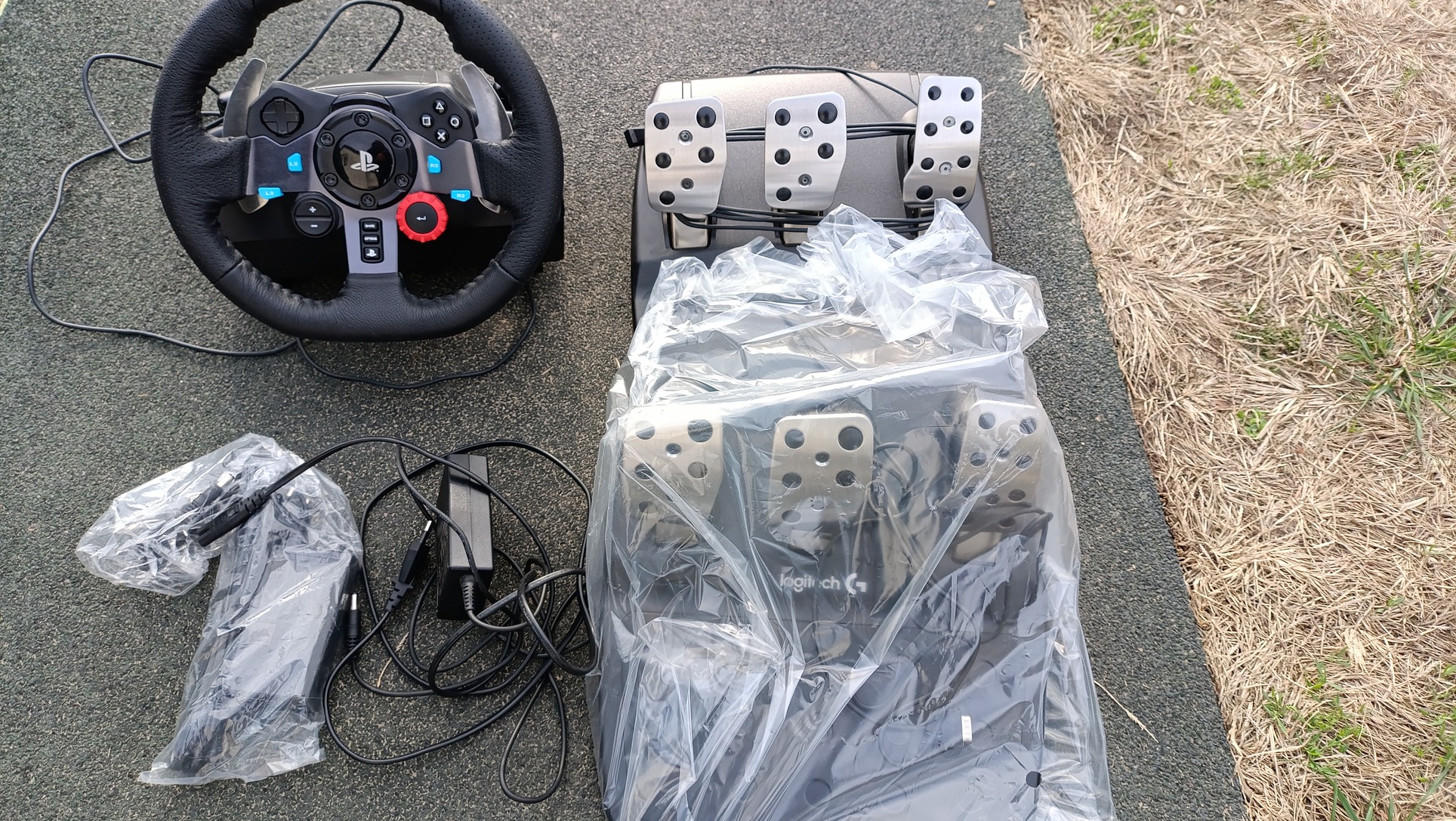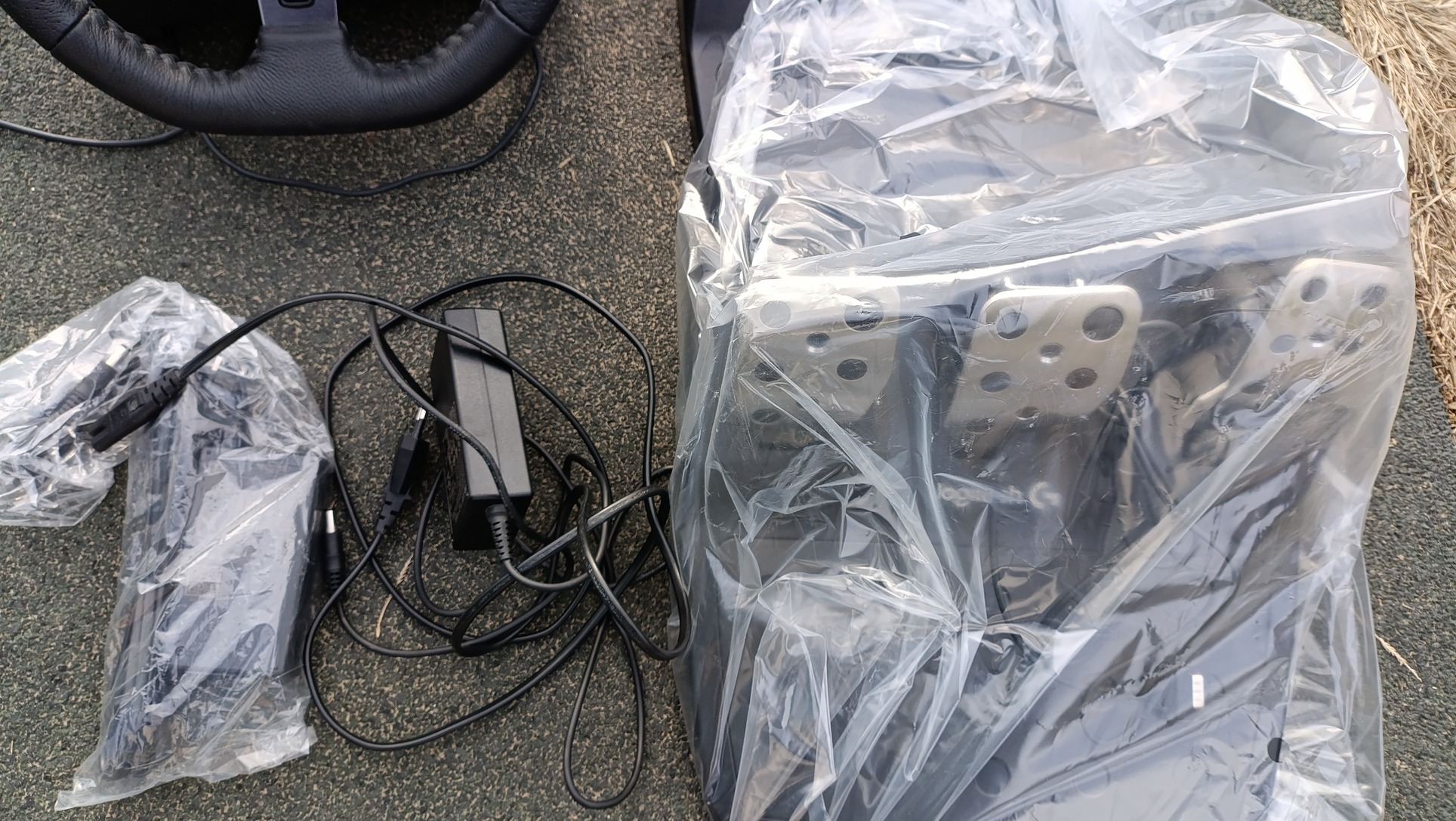 1 db kormány, 1 új pedálsor, 1 új táp és egy használt megkímélt pedálsor és egy használt táp
