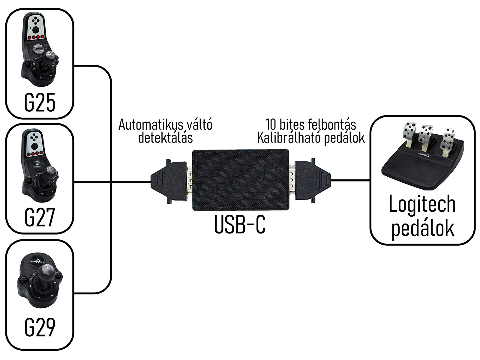 Automata váltótípus-detektálás: Az eszköz automatikusan detektálja, hogy Logitech G25, G27 vagy G29 váltót csatlakoztatsz rá, így mindegyikkel kompatibilis, még akkor is, ha később típust cserélsz. Logitech G25 és G27 váltók esetén a váltók gombjai is funkcionálnak!