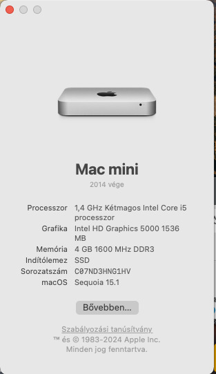 Eladó tökéletes állapotban lévő, de csak porosodó MAC Minim SSD-vel és 15.1 rendszerrel: