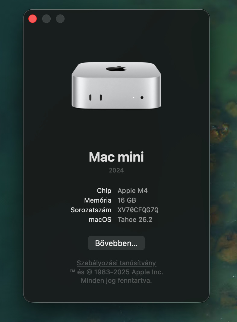 Mac mini M4 16/256 hibátlan, gyári tartozékok, bolti garancia 2027. január
