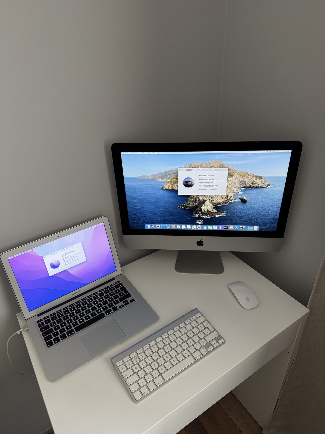 A Macbook Air 128GB-os SSD-vel szerelve és az elérhető legfrissebb MacOS-szel fut, az iMac-en jelenleg a Catalina mellett Windows 10 fut bootcamp-pel telepítve az 500GB-os SSD-t fele/fele arányban használva.