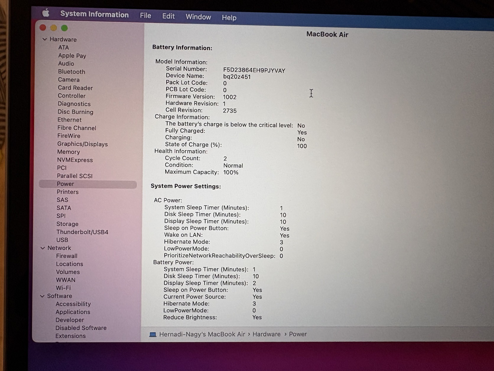 🔋 Akkumulátor állapota: 100% Cycle Count: 2