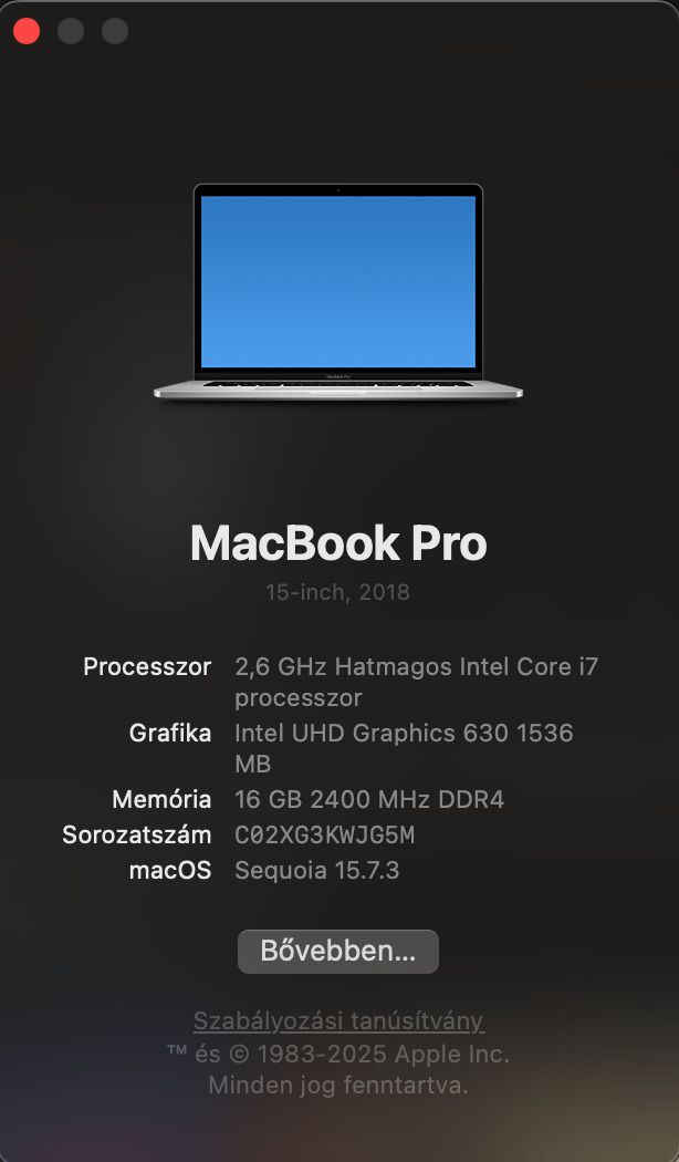 Eladó egy Apple MacBook Pro 15” (2018) laptop szép, megkímélt állapotban.