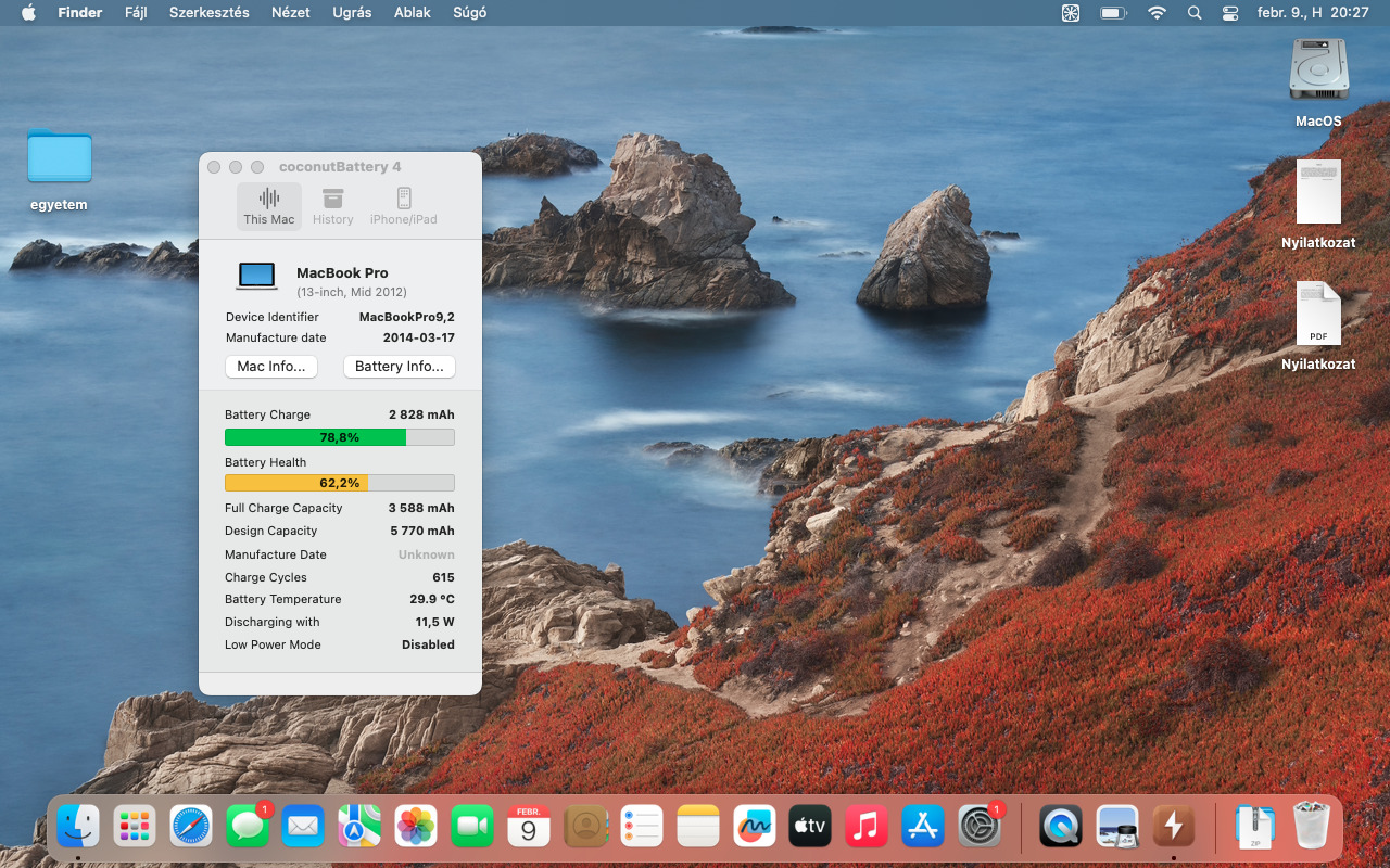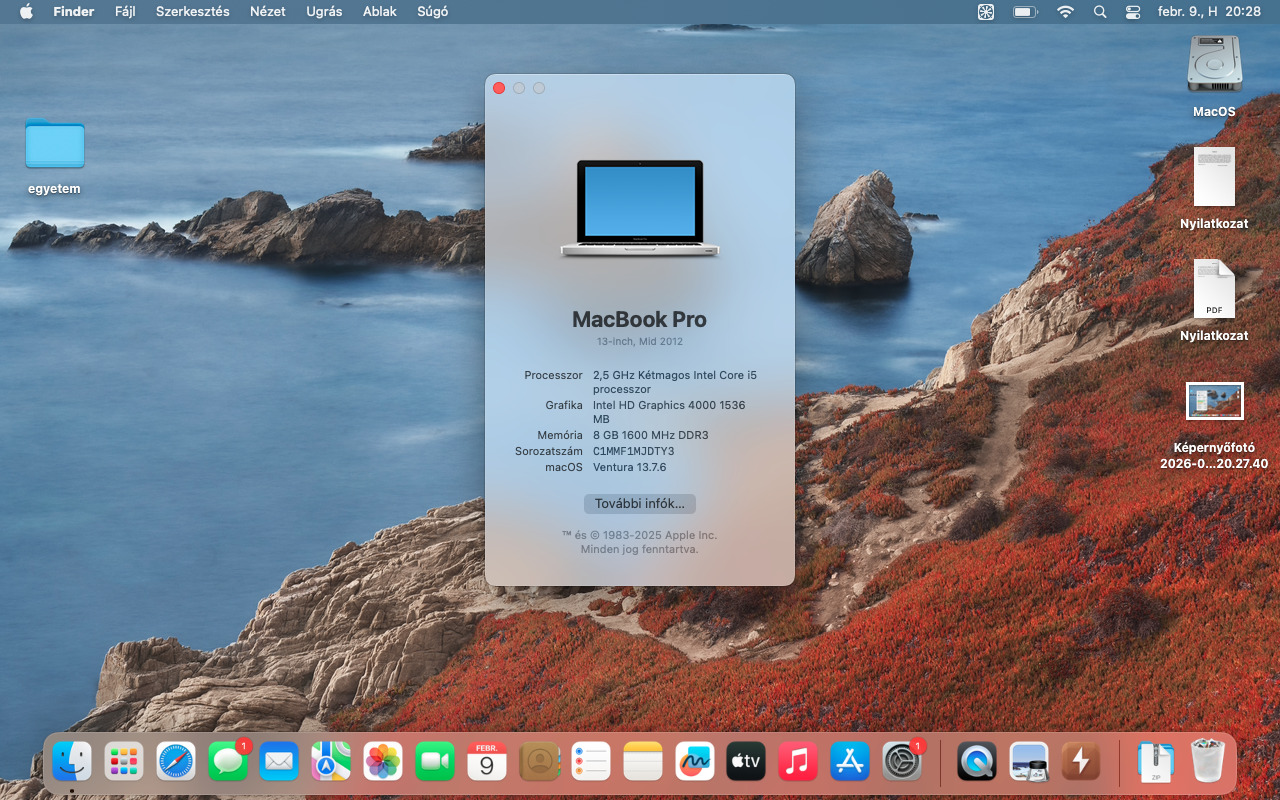 A külseje korának megfelelően viseltes állapotban van, karcok fellelhetőek a hátlapon és a fedlapon. A kijelző és a billentyűzet ellenben nem sérült. Jelenleg a Opencore Legacy Patcher-el a Ventura fut rajta hiba nélkül. Kérésre visszatelepítem az utolsó támogatott operációs rendszert is. Az akkumulátorral kapcsolatban cserét jelez, én nem cseréltem ki benne, akksiról is elmegy legalább 2 órát. 5 éve vásároltam használtan, vigyáztam rá, de nem tudom hanyadik tulajdonosa vagyok tekintve, hogy nem most volt 2012.