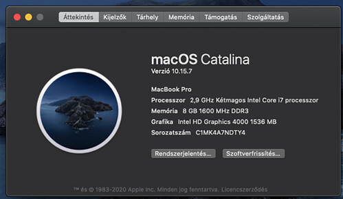 Eladó egy jó állapotban lévő MacBook Pro (2012 mid). 2.9 GHz-es i7-es processzor, 8 GB memória, 750 GB-os HDD. A billentyűzet és a HDD cserélve lett pár éve, de azóta alig volt használva.