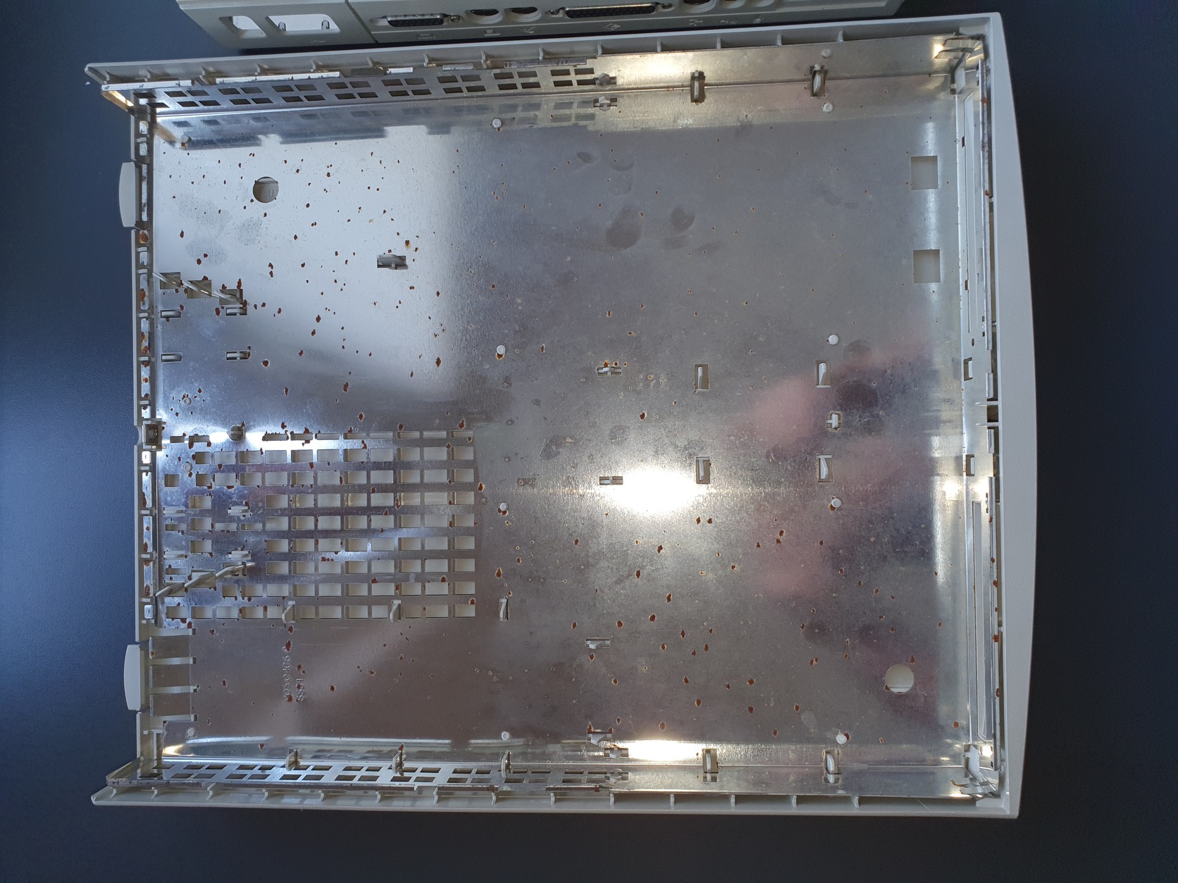 Az árnyékoláson lévő rozsda pöttyök a "fürdőben" keletkeztek, valamint a Macintosh embléma kopott színei is.