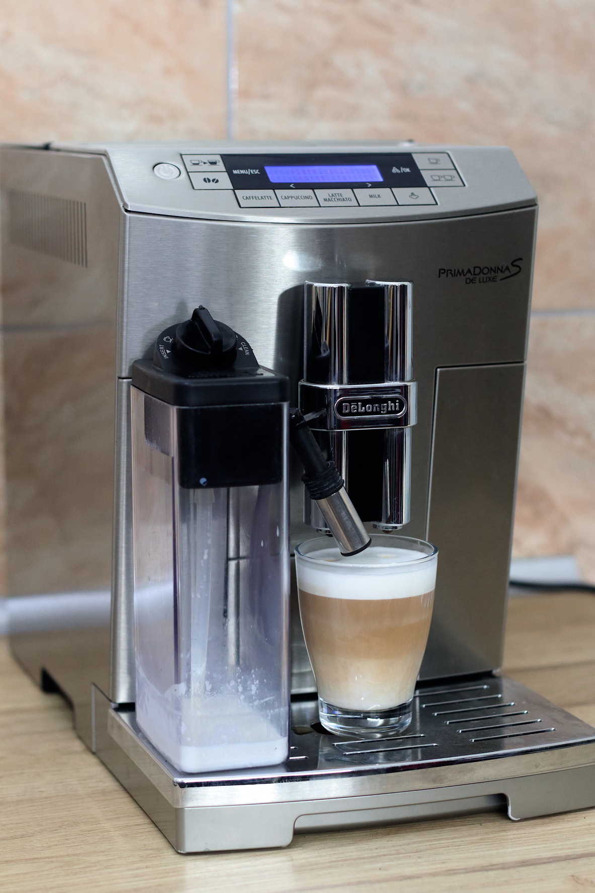 Eladó a képen látható szép állapotban lévő és hibátlanul működő Delonghi Primadonna S Deluxe (teljes szálcsiszolt fém borítás) automata kávéfőző tejtartállyal.