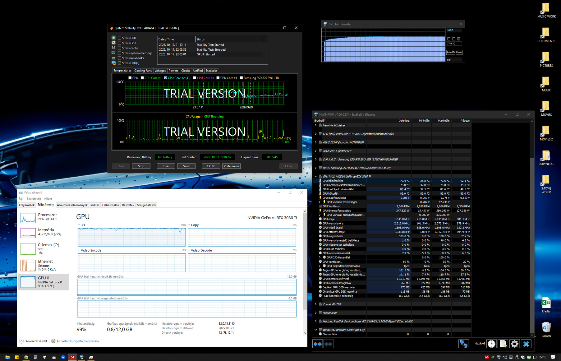 Tettem fel egy képet a stressztesztről, amit a kiszerelés előtt készítettem. Terhelés nélkül 26-27C fok között fagyoskodik, és csutkára hajtva 77-78C környékén van a max. hőmérséklete. Ha újrapasztázod, akkor kb. 65-67C foknál nem kúszik feljebb.