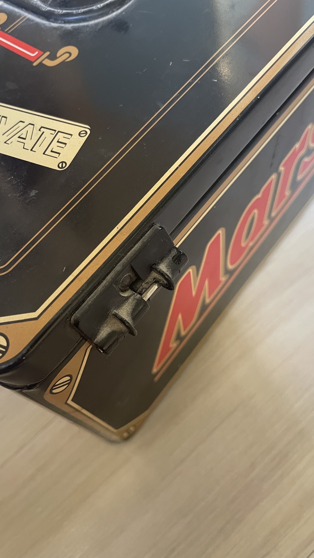 Az egyik műanyag zsanér eltörött, így csak levehető a teteje, nem nyitható szabályosan