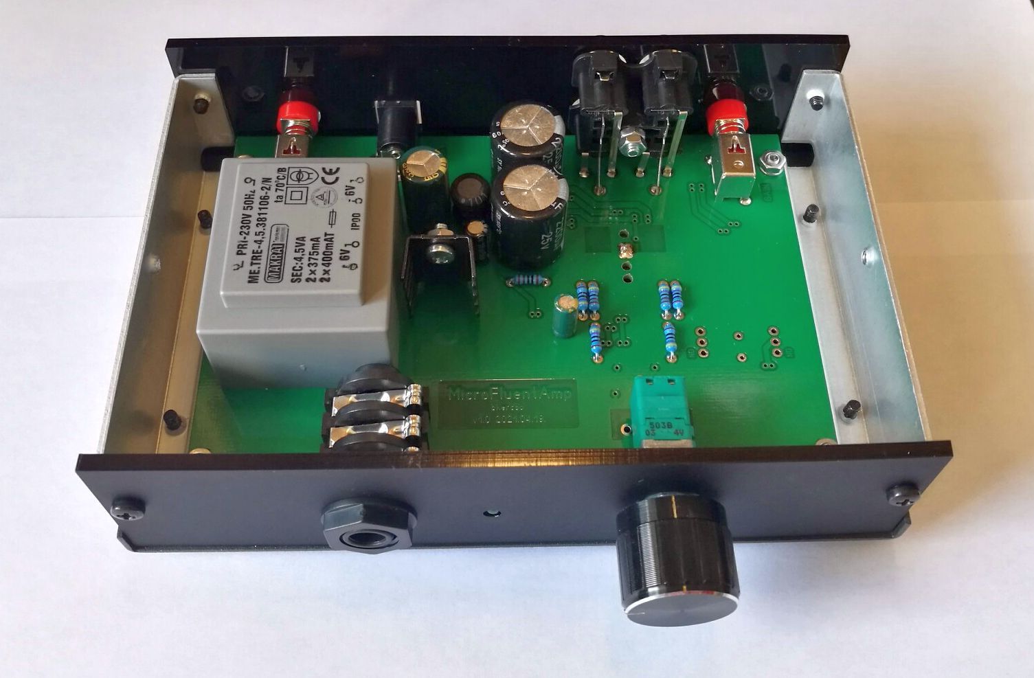 A MicroFluentAmp az S100A erősítő alumínium dobozba bújtatva és erősítéskapcsolóval kiegészítve.