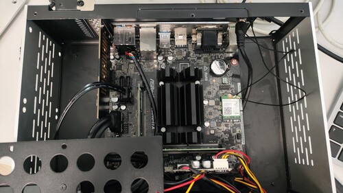 - Asrock J5040-ITX alaplap (Intel J5040 CPU 4 fizikai core, integrált VGA, HDMI, gigabit ethernet, WiFi, 4 SATA, PCIe bővítő, passzív hűtés, többcsatornás hang)