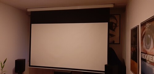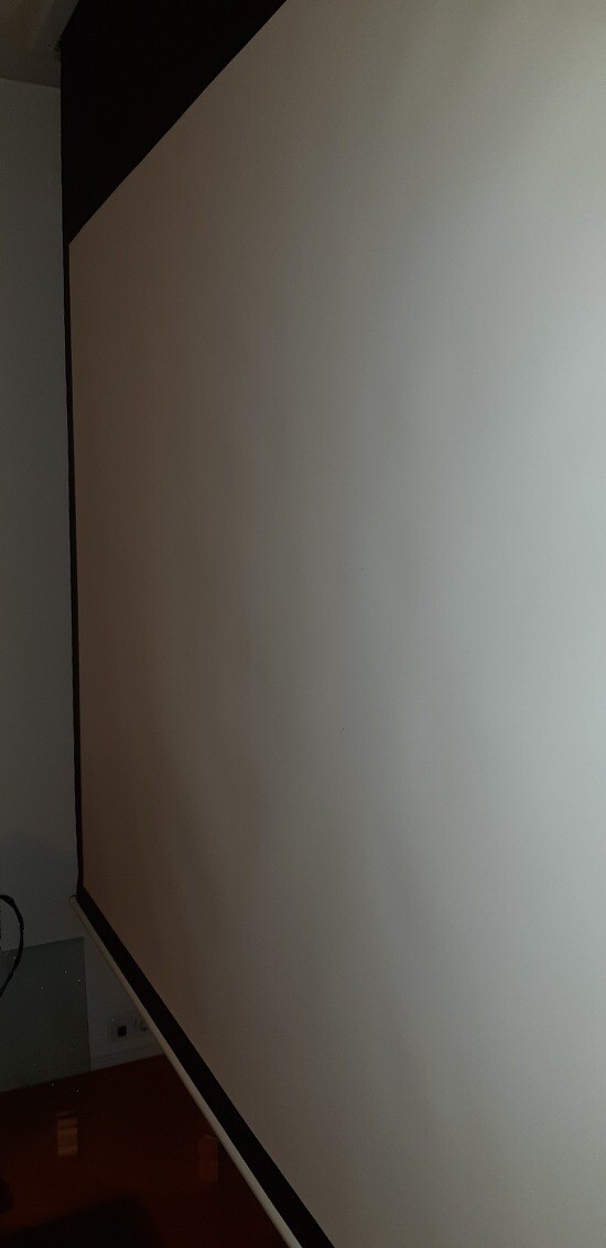 Eladó a képeken látható Moovia motoros vetítővászon. 16:9-es arányú, a vetített kép szélessége a fekete keret nélkül 260cm. így a magassága kb. 146cm.