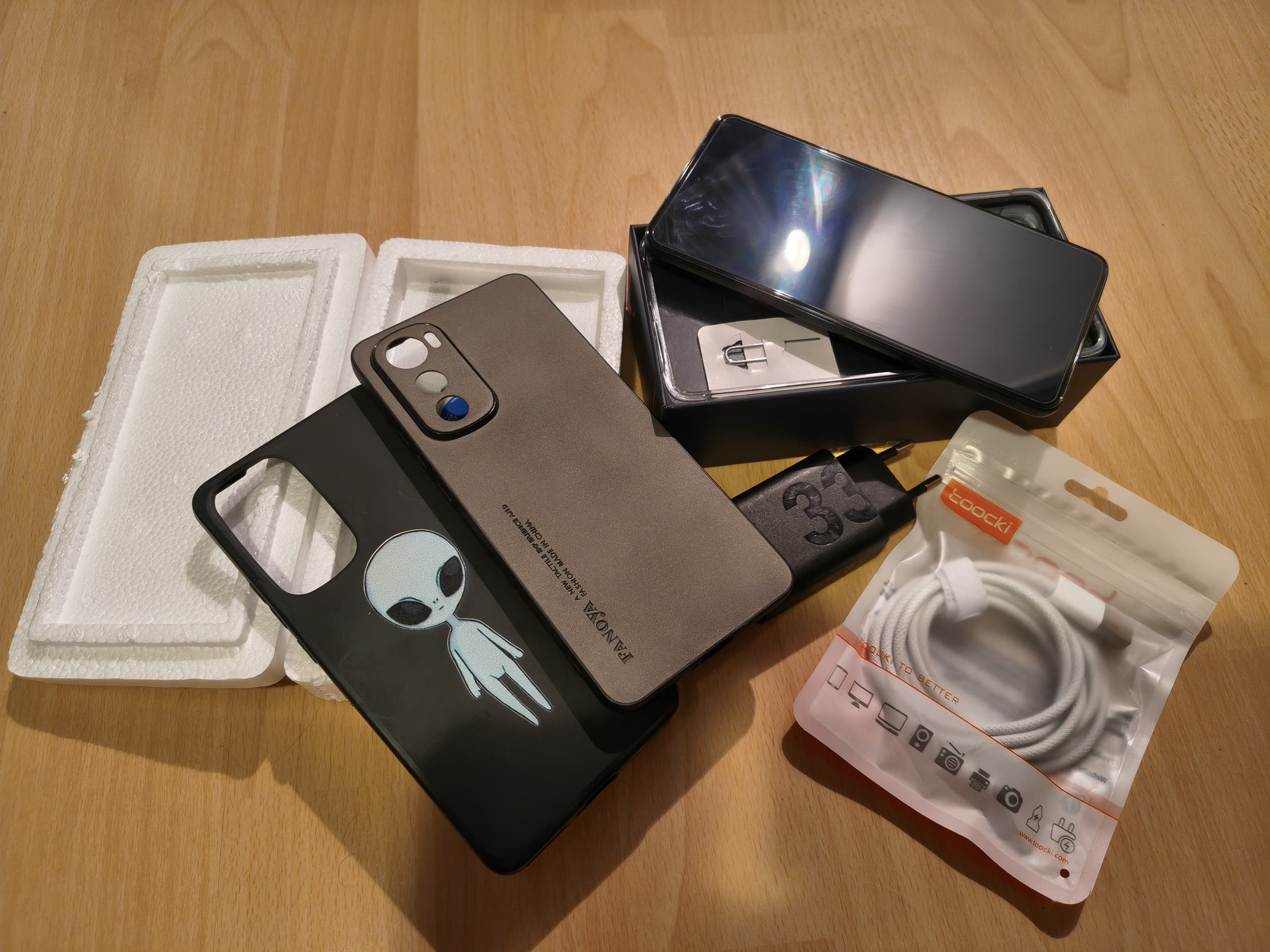 A gyári töltőkábelje nemrég felhasadt, így adok mellé egy új, 6A/100W-ra képes, szövetborításű USB-A to C kábelt. A gyári tokja mellett adok hozzá +2 tokot és 2 üvegfóliát is.