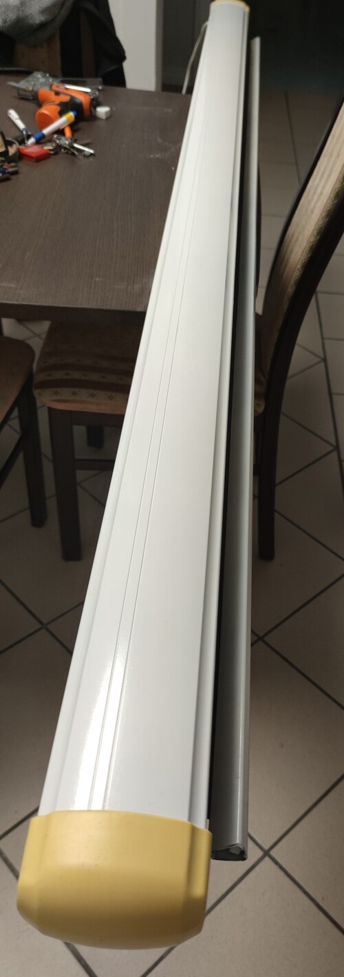 A képeken lévő 202 cm vászonszélességű (220cm a teljes szerkezet), 4:3, 16:9.. tetszőleges méretű vászon, motoros (230V) le-fel tekerés, bárhol megállítható. A műanyag széltakarók besárgultak, a vászon jó állapotban van. Márkajelzés nincsen rajta.