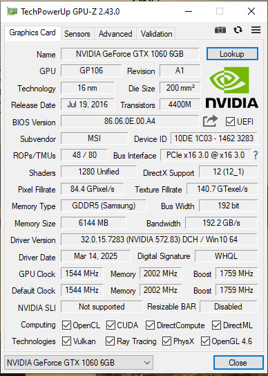 MSI GeForce GTX 1060 Armor 6GB OC