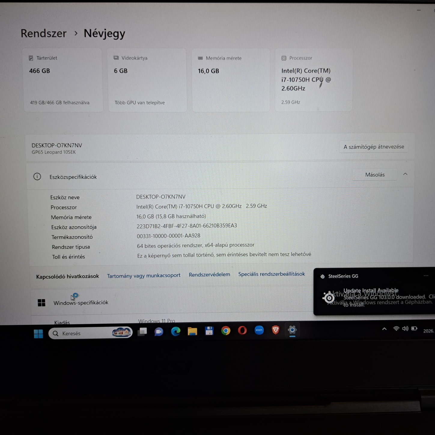Eladóvá vált kihasználatlanság miatt egy MSI GP65 Leopard 10SEK gamer laptop 2022 óta Go Pro kép és videó szerkesztésre volt használva játékidő szinte nulla