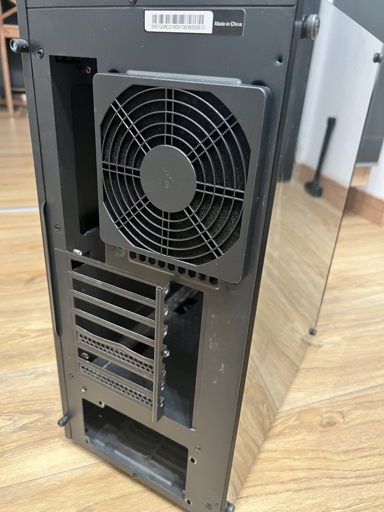 Kicsit viseletes hátú (meg lett picit nyitva, hogy beférjen egy nagyobb kártya) ezért annyi amennyi. Gyárilag világító ledes a ház hűtője. Oldalt a plexi csavarok is megvannak, a mágneses porvédők is a helyükön vannak, az elülső USB-k és bekapcsoló gomb is hibátlan.