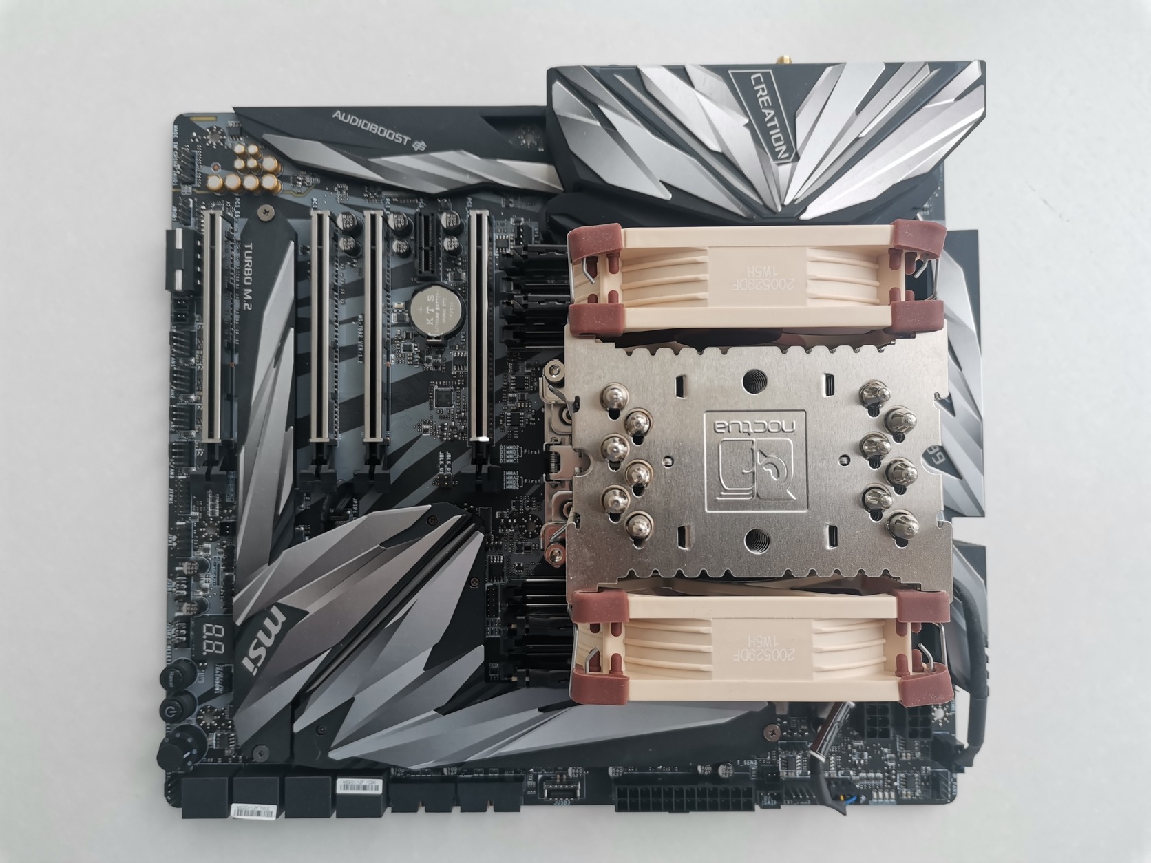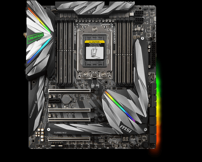 Alaplap: MSI Meg X399 Creation, kategóriájában talán a lehető legtöbb tuningpotenciállal felvértezett alaplap, tekergethető tuning-gombbal, lopakodó repülőt ábrázoló, RGB-s színekben pompázó chipset és NVMe hűtéssel....