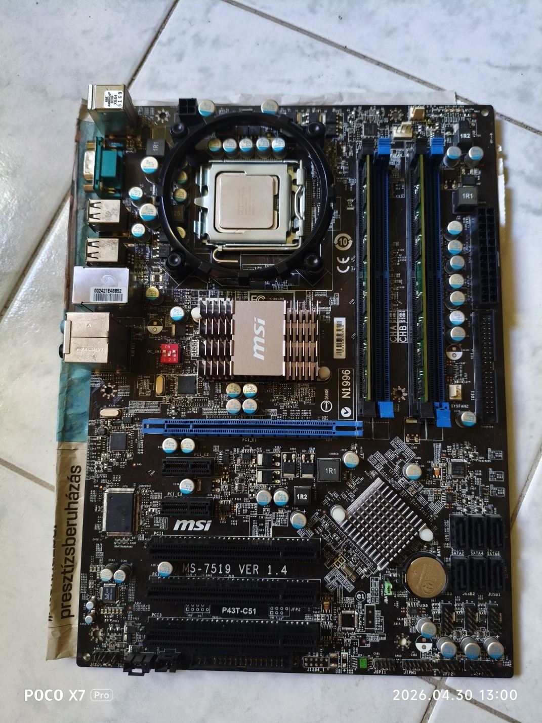 Alaplap: MSI P43T-C51 LGA 775 alaplap I/O shield-jével. Adok hozzá egy CPU hűtő keretet is, így nem csak a gyári felfogatású hűtőkkel lehet szerelni.