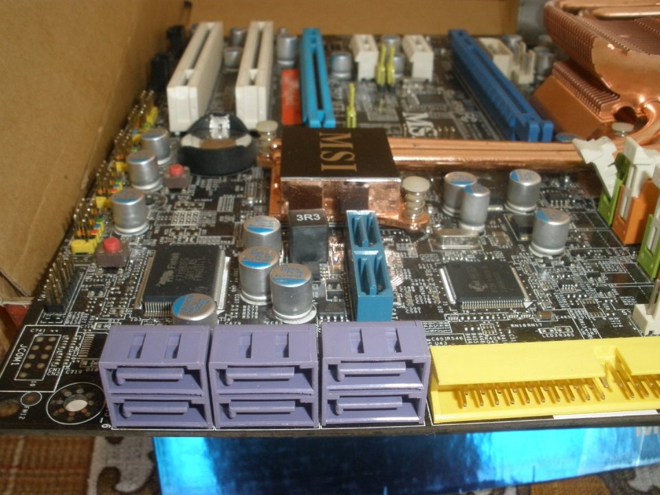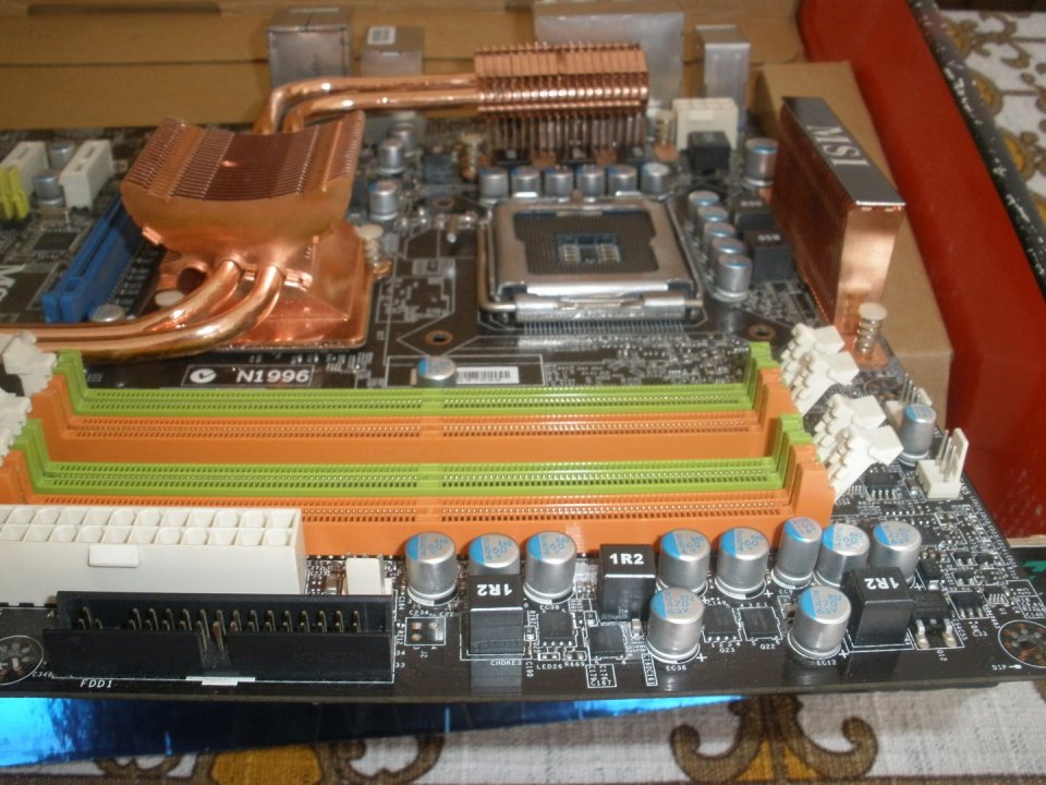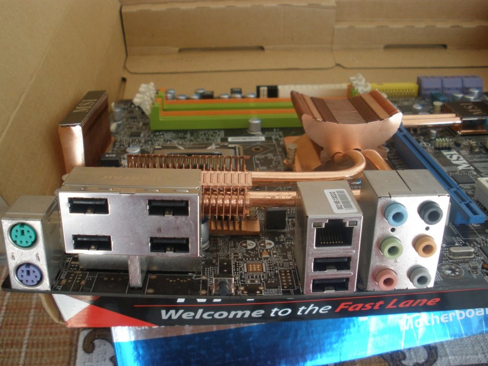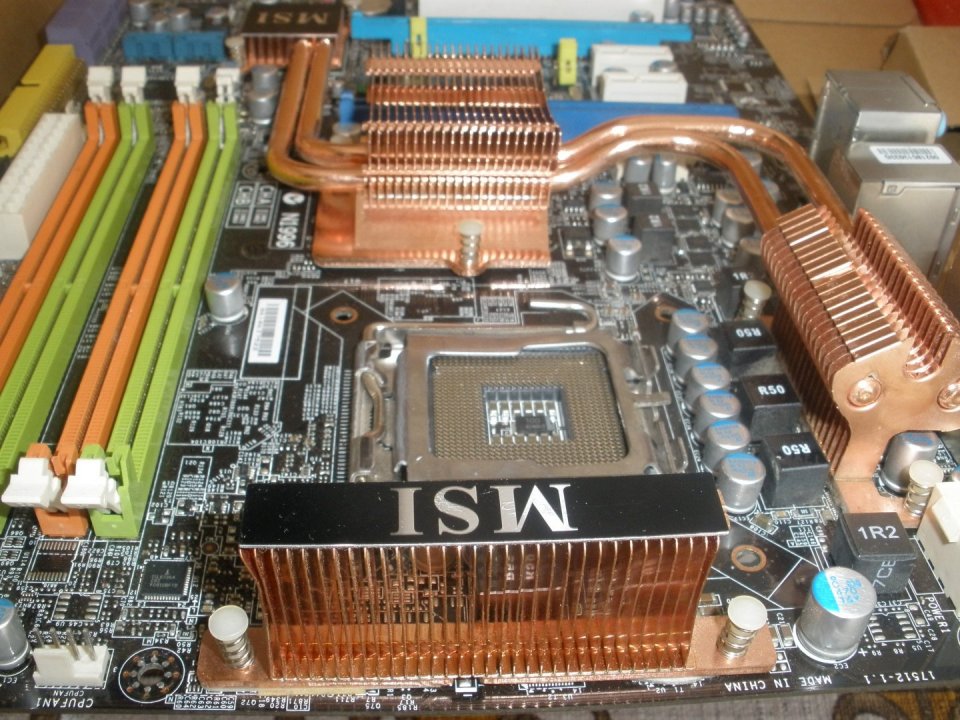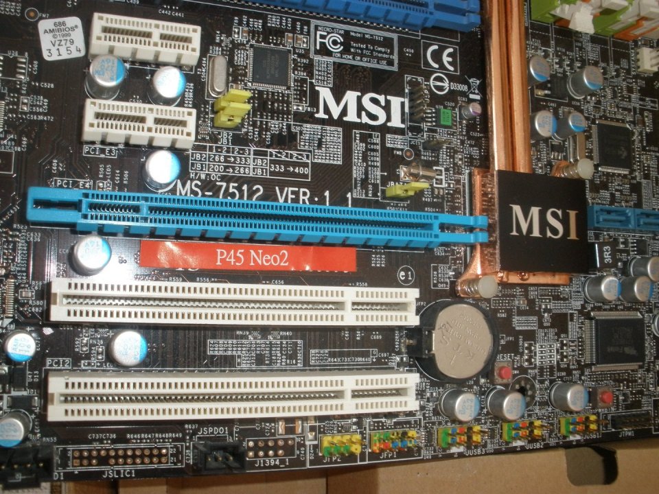 MSI P45 Neo2 LGA775 alaplap. Egy 4 tűs cpu- és 5 db. 3 tűs rendszerhűtő csatlakozó az alaplapon.