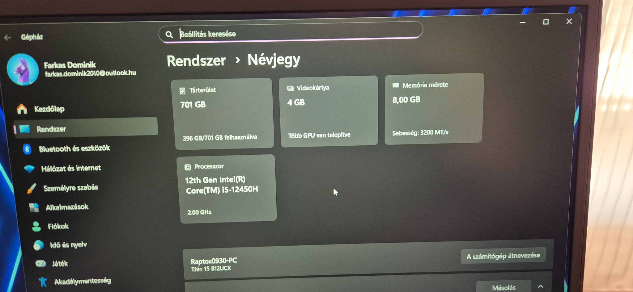 RAM : 1x8GB DDR4 3200Mhz (van még egy foglalat)