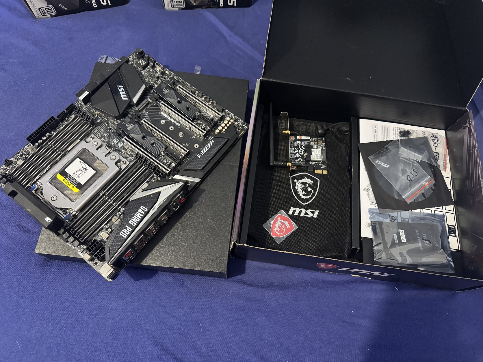 Ebayről rendeltem használtan, Németországból jött meglehetősen hiányosan. IO shieldje már nem volt és egy wifi antenna is hiányzik, de csak a kép készítésekor tűnt fel mert sosem használtam. A középső M.2 takaró fém elem sincs neki. Engem különösebben nem zavart vagy gátolt bármiben ezek hiánya. Ami a második képen látszik az van (a dokumentáció alatt van egy doboz valami műanyag díszelemekkel).