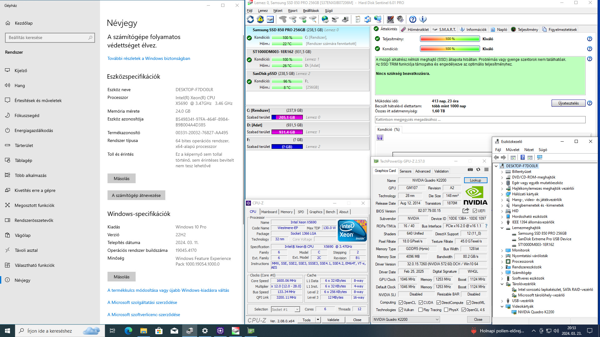 Munkaállomás! HP Z400 - Xeon X5690 6 mag! / 24GB DDR3 / 256GB SSD + 1TB / Nvidia Quadro K2200 / USB3