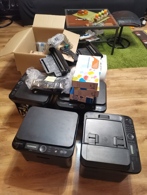 Samsung CLX-3175 színes lézer nagy csomag eladó! :) Négy működőképes gép, mindenféle plusz alkatrésszel.Volt ilyen projektem, hogy mindig vettem egy-egy donor gépet (ezek ráadásul mind működő gépek voltak), hogy egyet tökéletes állapotban tartsak. Sajnos a raktározási lehetőségeimet kinőttem ezzel a "vállalkozással", ráadásul sokkal modernebb gépeim is vannak azóta. Ezért egy fix ötvenezer forintért eladom ezt a sok gépet. Az egyik oldala le van szedve, abból még tavaly kivettem a fusert, hogy majd egy jobbat beleteszek, de akkor idő hiányába abbahagytam ezt a szerelgetést. A dobozban van vagy húsz toner, meg jó fényhengerek, transfer beltek, mindenféle. Látható, hogy origi tonerek is vannak. Egy-két kábelt is adok a packhoz. Elvinni Észak-Pestről lehet, nyilvánvaló, hogy Smart-nál nagyobb autóval. :D
