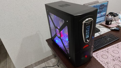 A ház tartalmaz ezenkívül 3 db 8cm-es ventilátort is. 1 db fekete felül, 2 db négyszínű ledes, elől/oldalt. A ház elölnézeti képén legalul jól látható az egyik ledes venti működés közben.