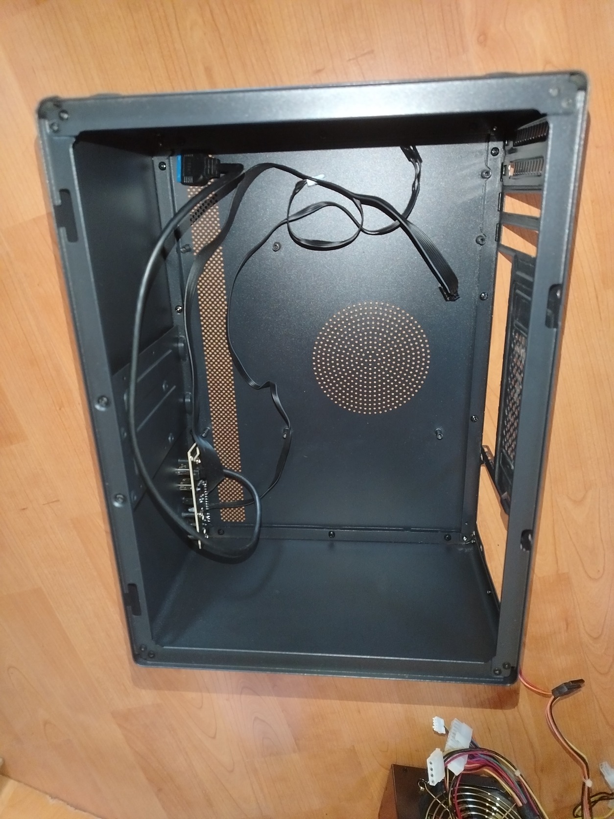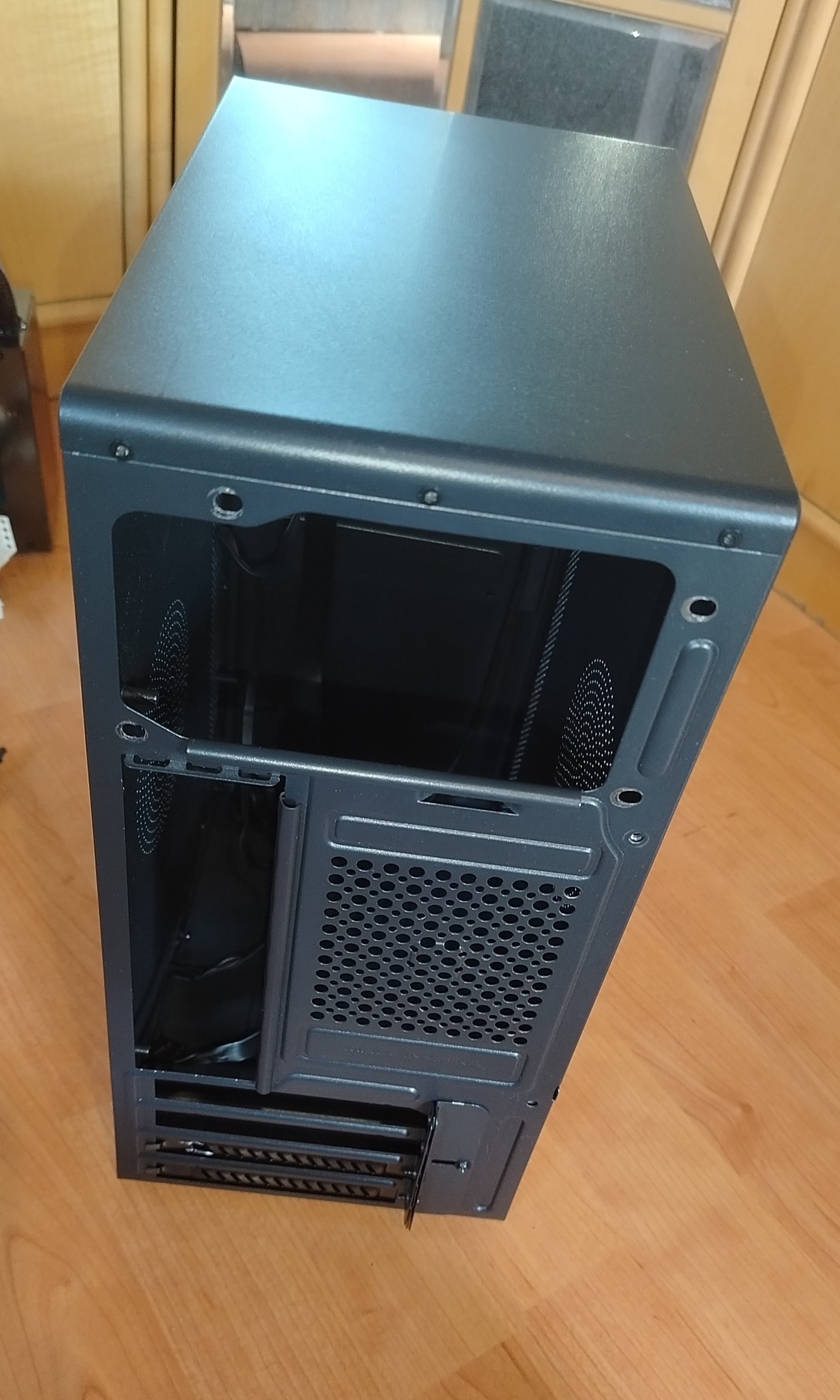 Gyári szellőző nyílásokkal, és pár sys fan venti lehetőséggel, jól szellőző ház. Matx lap volt benne, tehát ez is belemegy gond nélkül.. HDD (3.5 colos) függőlegesen helyezhető el benne, keret benne van. SSD-t alulra!