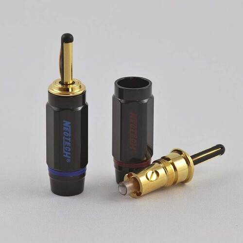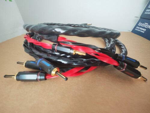 Eladó Neotech Nemos 3080 típusú UP-OCC (nagy tisztaságú monokristályos) tömör réz vezetőjű 2x2 méteres hangfalkábel a KáCsa Audió szakemberei által single wire módon Neotech NCB-80 banándugókkal forrasztás nélkül szerelve.