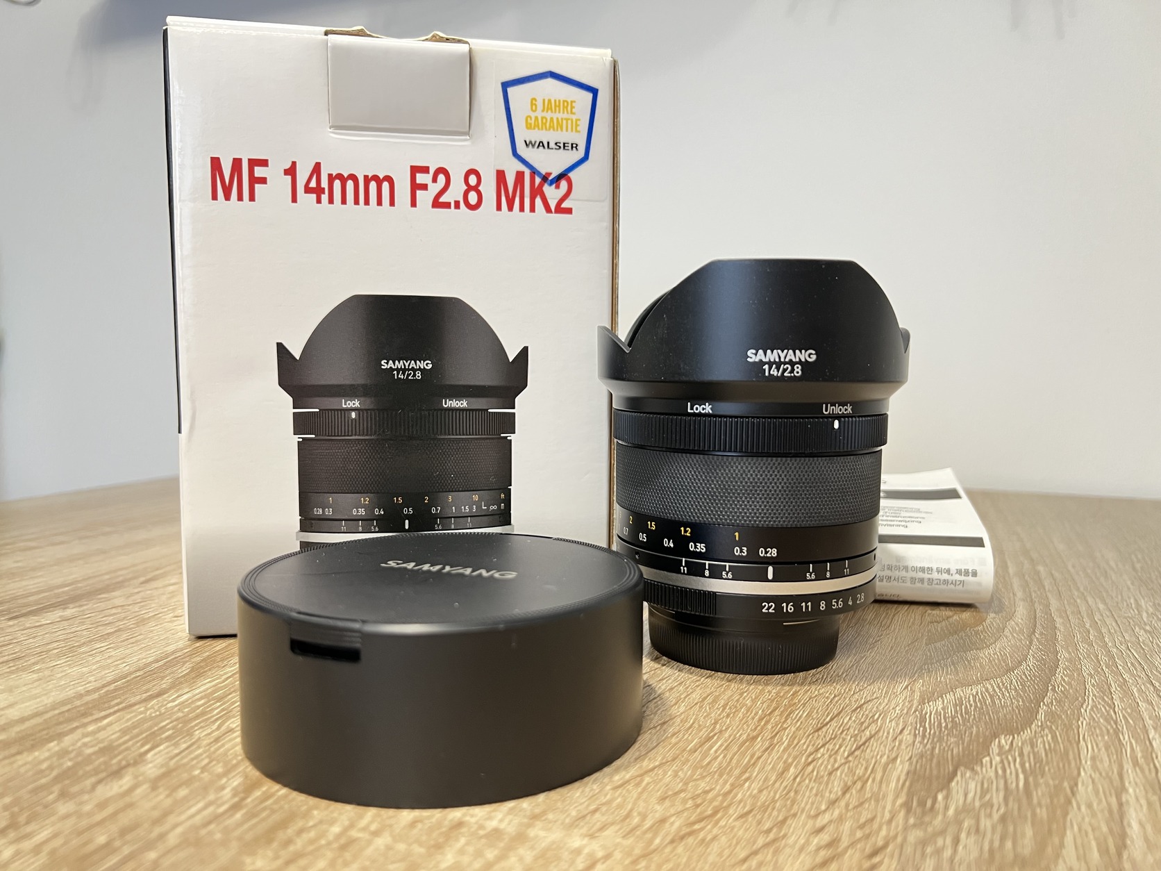 Samyang 14mm f2.8 MF Mk2 nagylátószögű pengeéles rajzolattal, hibátlan, sérülésmentes új állapotú, a kupakon látszik pár karcolás) dobozában, sn:27947, ára: 105e Ft.