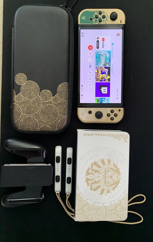 Eladó címben említett Switch, dobozával, papírjaival plusz Zelda-s hordozójával.