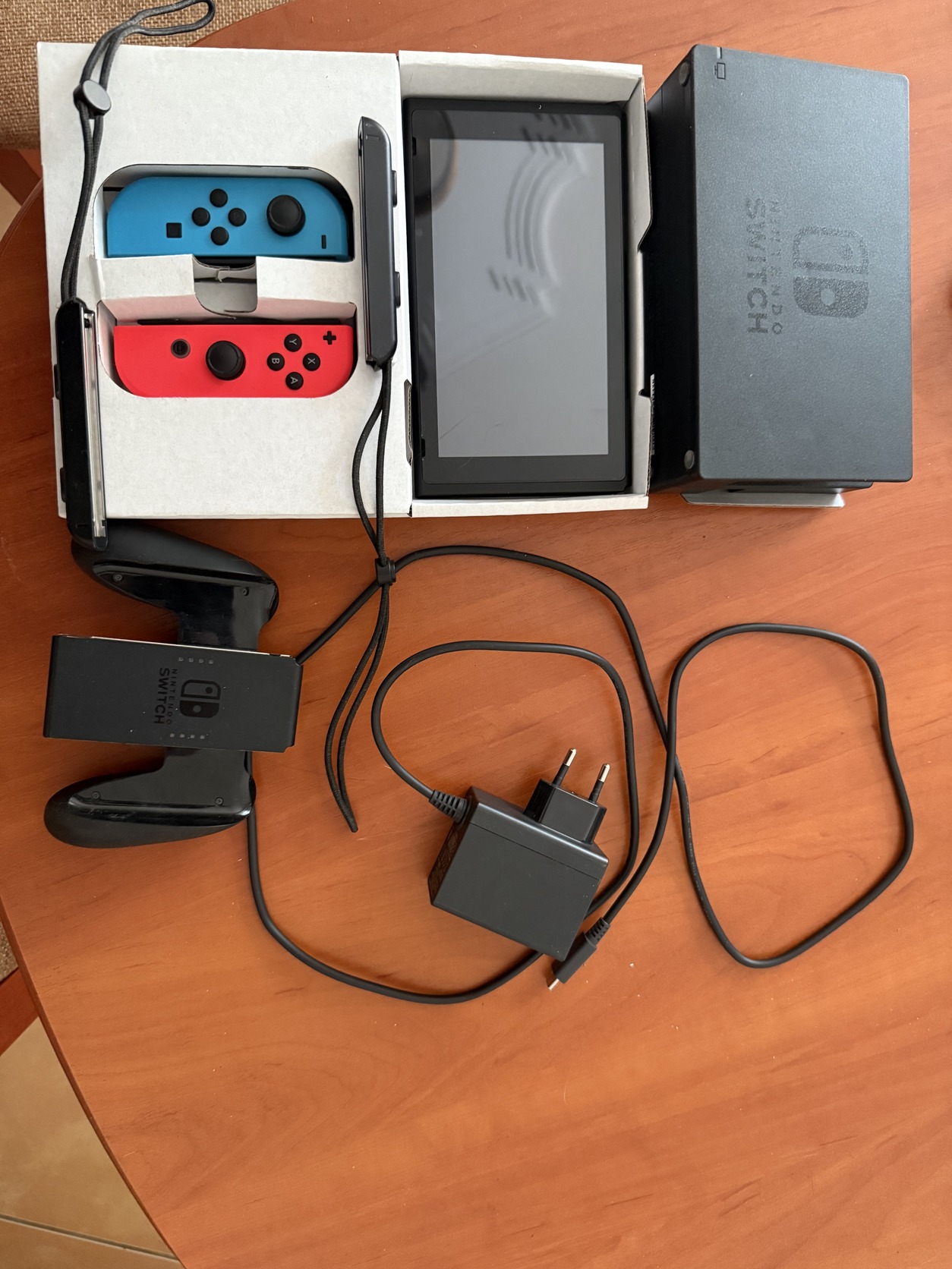 Doboza és minden gyári tartozék (dokkoló, Joy-Con-ok, kábelek, markolat) megvan.