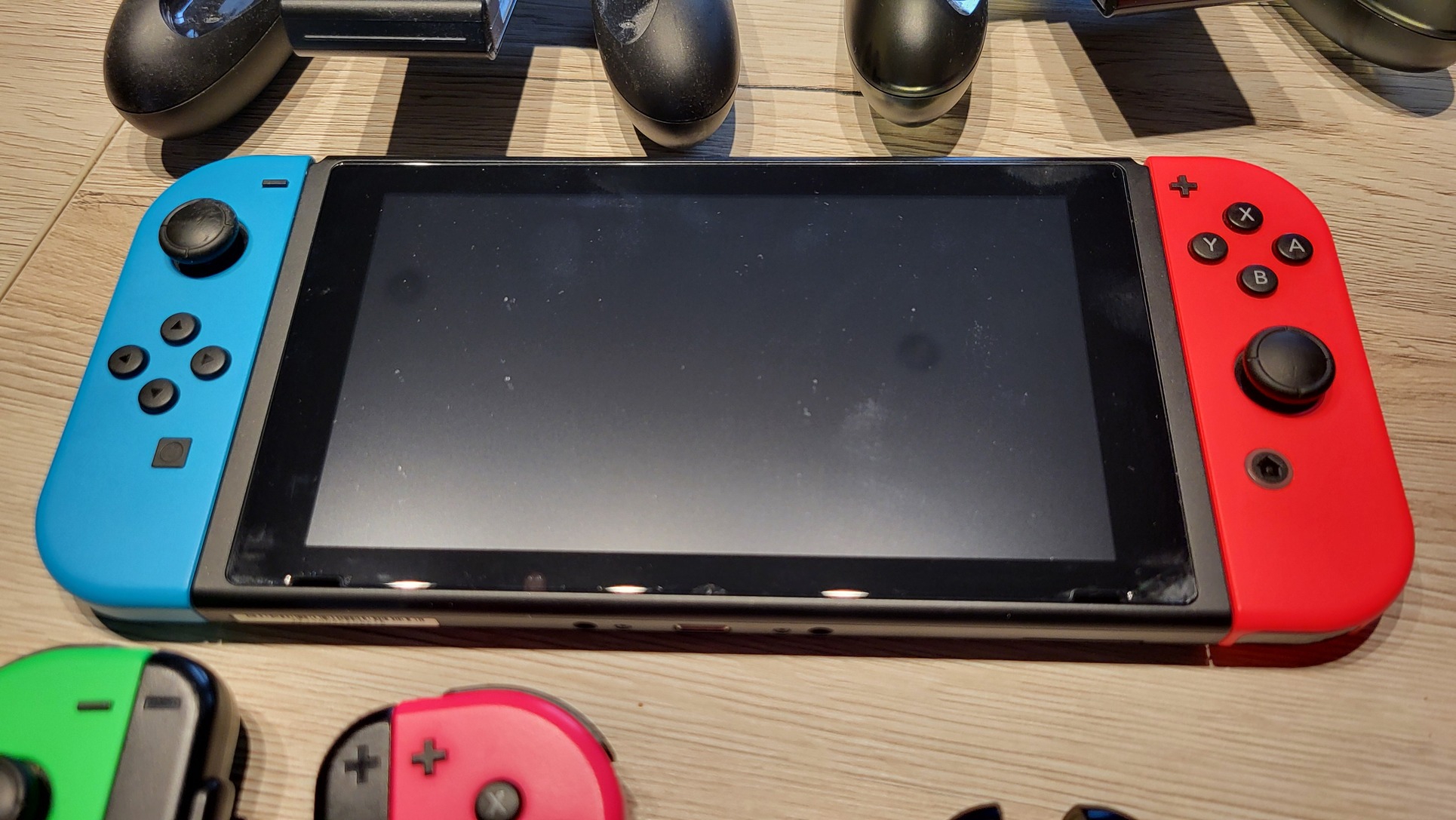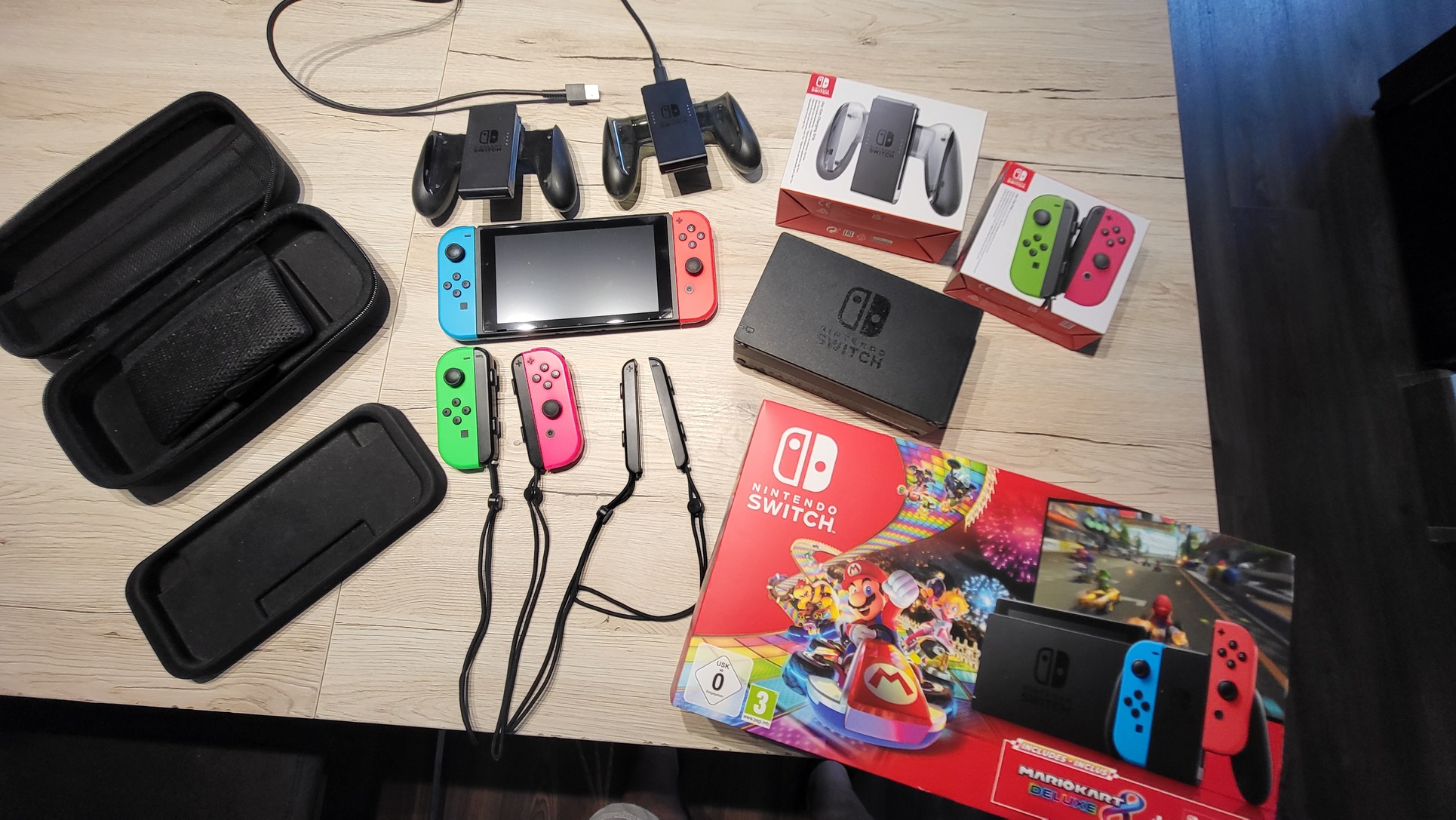 - Nintendo Switch V2 alapgép + gyári dokkoló + gyári kábelek (adapter + HDMI)
