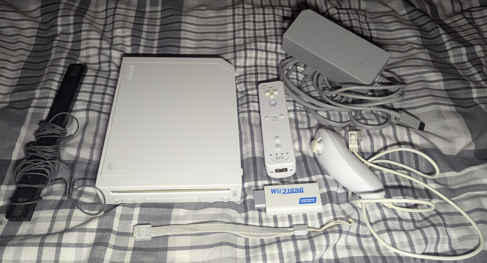 Tápegység, mozgás érzékelő, Wii Remote vezeték nélküli controller + Nunchuk, HDMI adapter, képen látható 4 db játék.