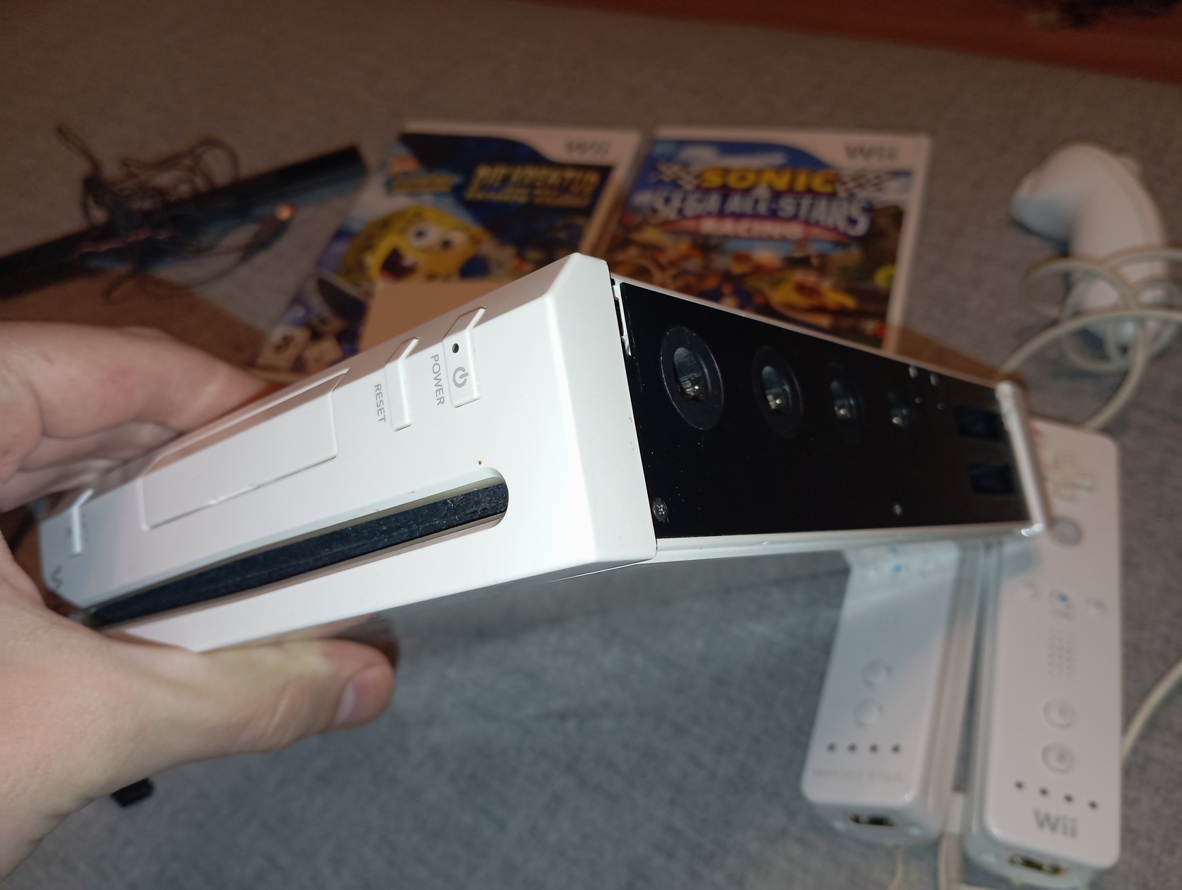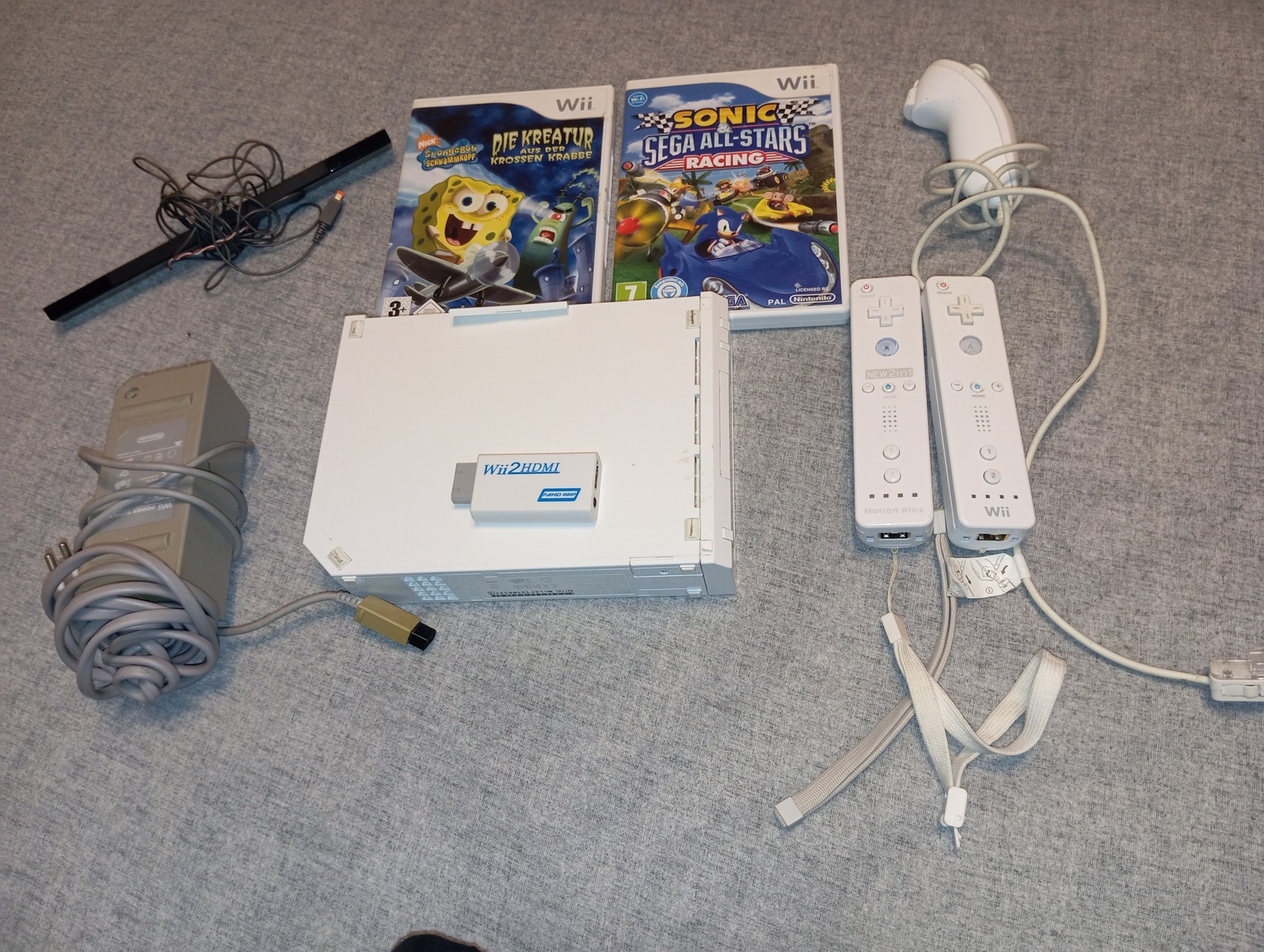 jár hozzá 2 wiimote, 1 gyári (hibás), 1 utángyártott (hibátlan), 1 nunchuk, gyári táp, 2 játék, sensor bar