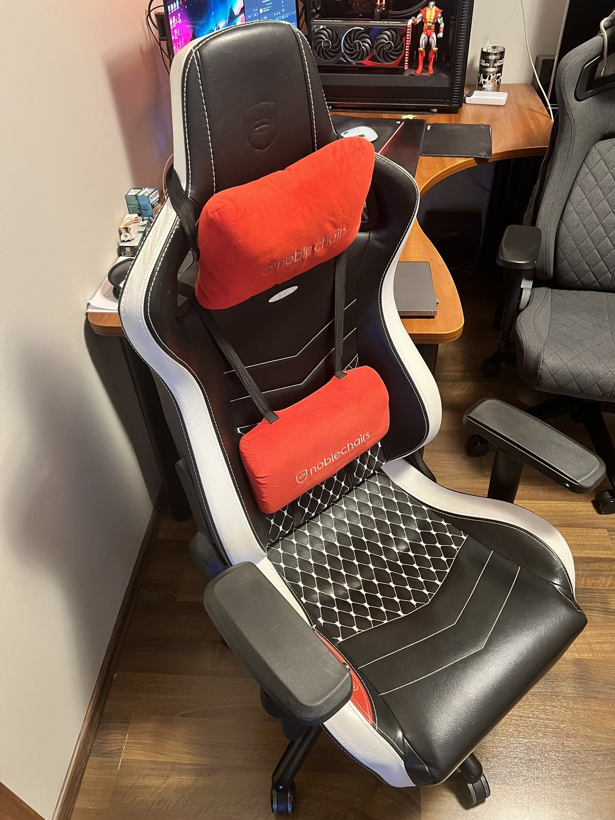 Eladó márkaváltás miatt Noble Chairs Epic Real Leather gaming székem fekete-fehér-piros színben.