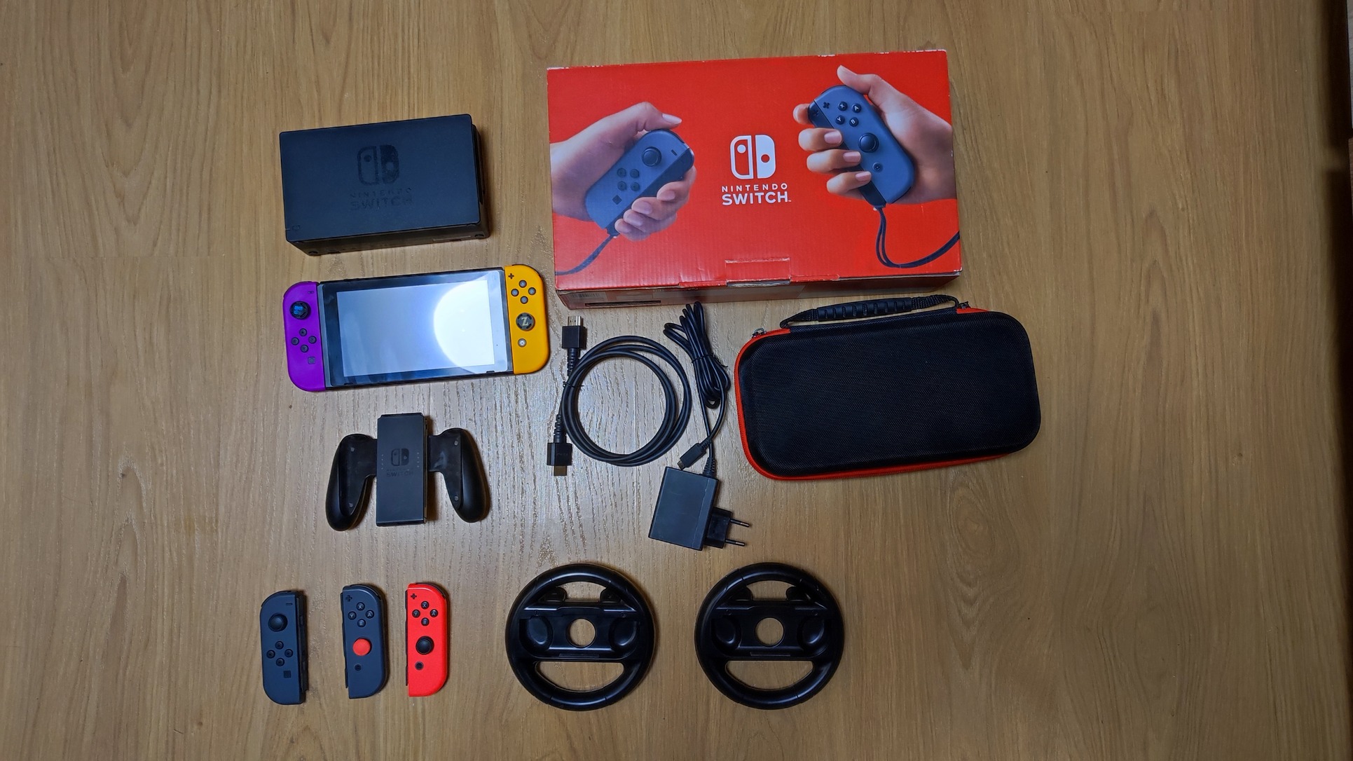 -Minden gyári tartozék: Dock (tévés csatlakozáshoz), HDMI kábel, gyári töltő, Joy-Con grip és csuklópántok.