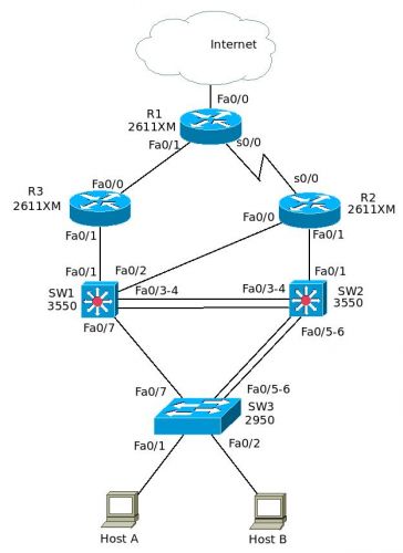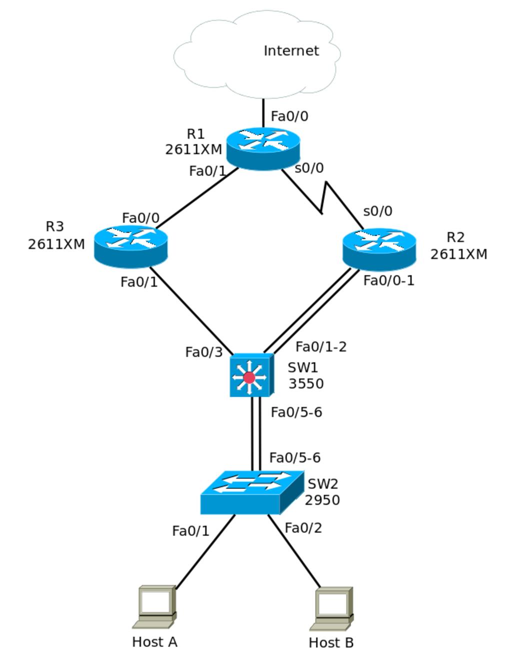 SW1 és SW2 között konfigurálható layer 2 vagy layer 3 etherchannel, azt is lehet, hogy SW1 és SW2 között PAgP mig SW2 és SW3 között LACPR1, R2, R3, SW1 és SW2 között, csak a fantázia szab határt az 5 routolásra képes egység között különböző routing protokolok konfigurálásának: (B)EIGRP, named EIGRP,, OSPFv2, OSPFv3, RIP, RIPng, iBGP, EBGP, IS-IS(/B)