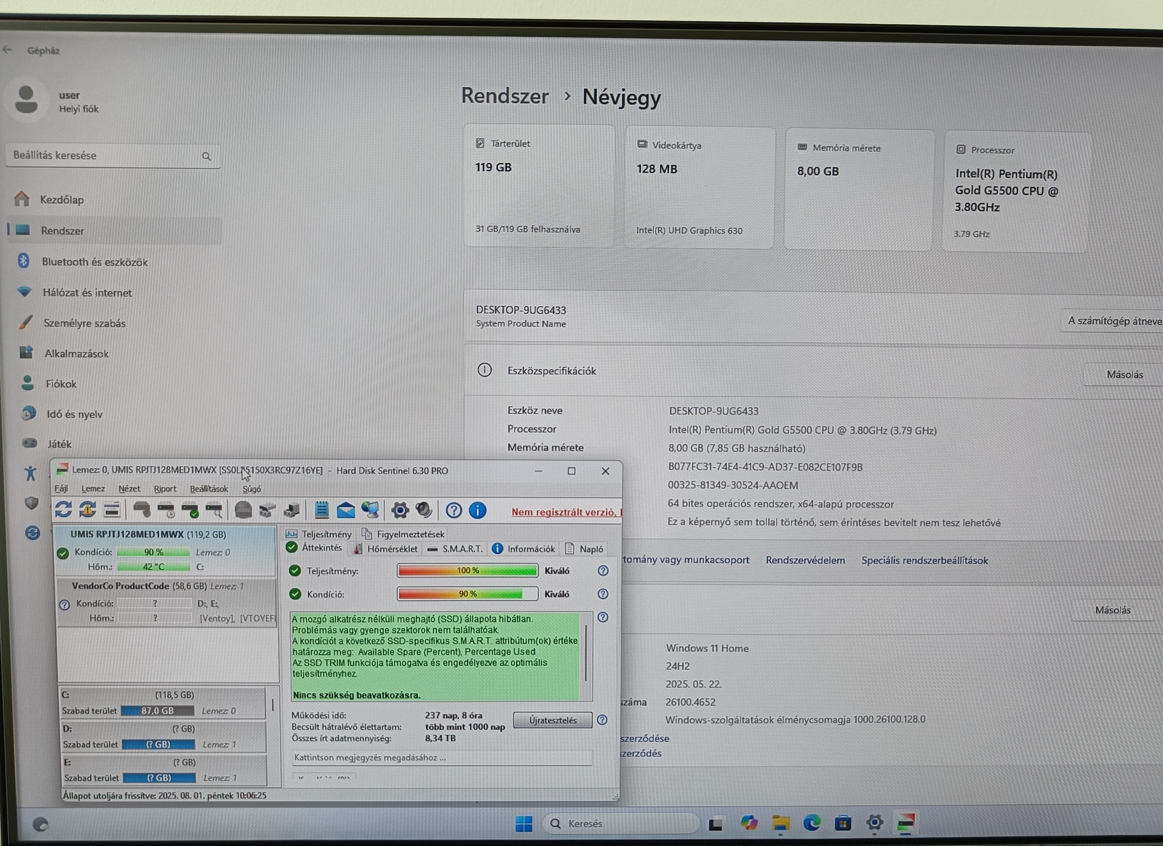 Olcsó, de nem hibátlan Windows 11 kompatibilis PC(Pentium G5500, 1x8GB DDR4,128GB nvme SSD, Wifi+BT)