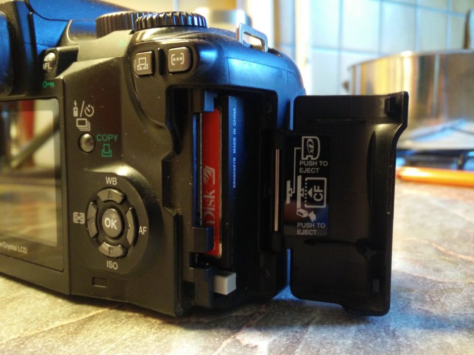 A gép két memória kártya foglalattal is rendelkezik, melyek közül az egyikbe XD a másikba pedig CF kártya passzol.