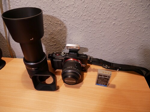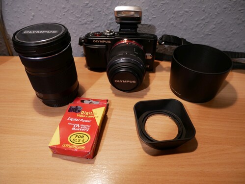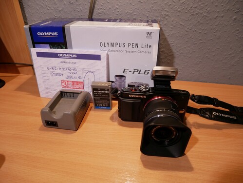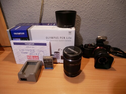 A szett tartalma epl-6 váz 14-42 és 40-150 objektív FL-LM1 vaku,doboz,papirok,cd,töltő,vázsapka minden eredeti.