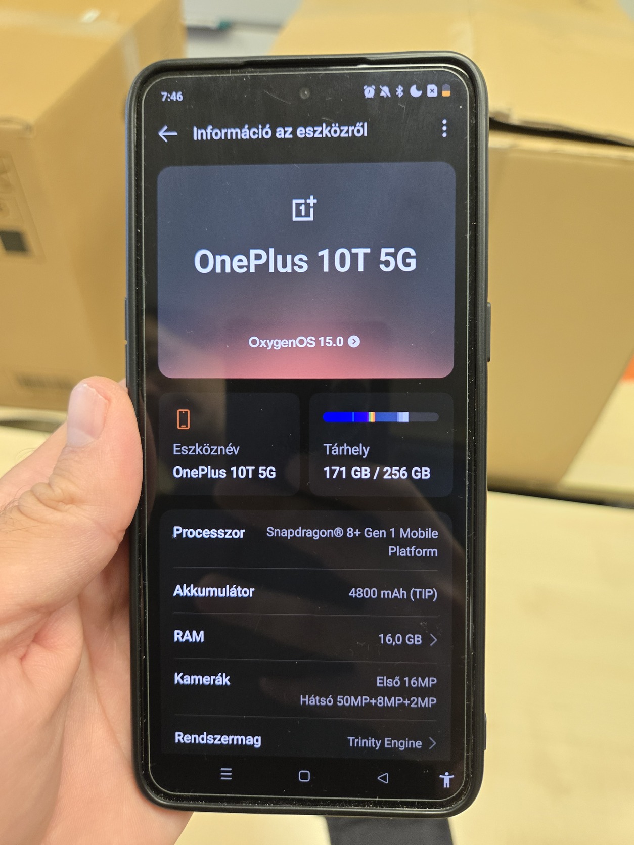 Eladó egy OnePlus 10T 5G telefon fekete színben, gyári 150W-os töltőjével.