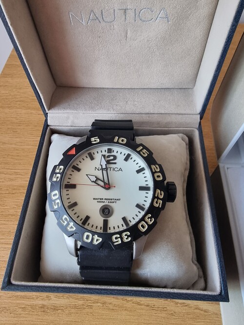 -Nautica óra,szinte új állapotban,dobozában.100 m vízállóság, quartz szerkezet, 50mm átmérő. :37000 ft