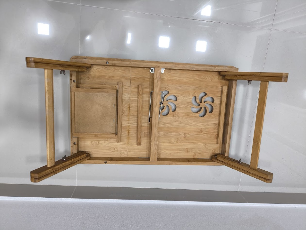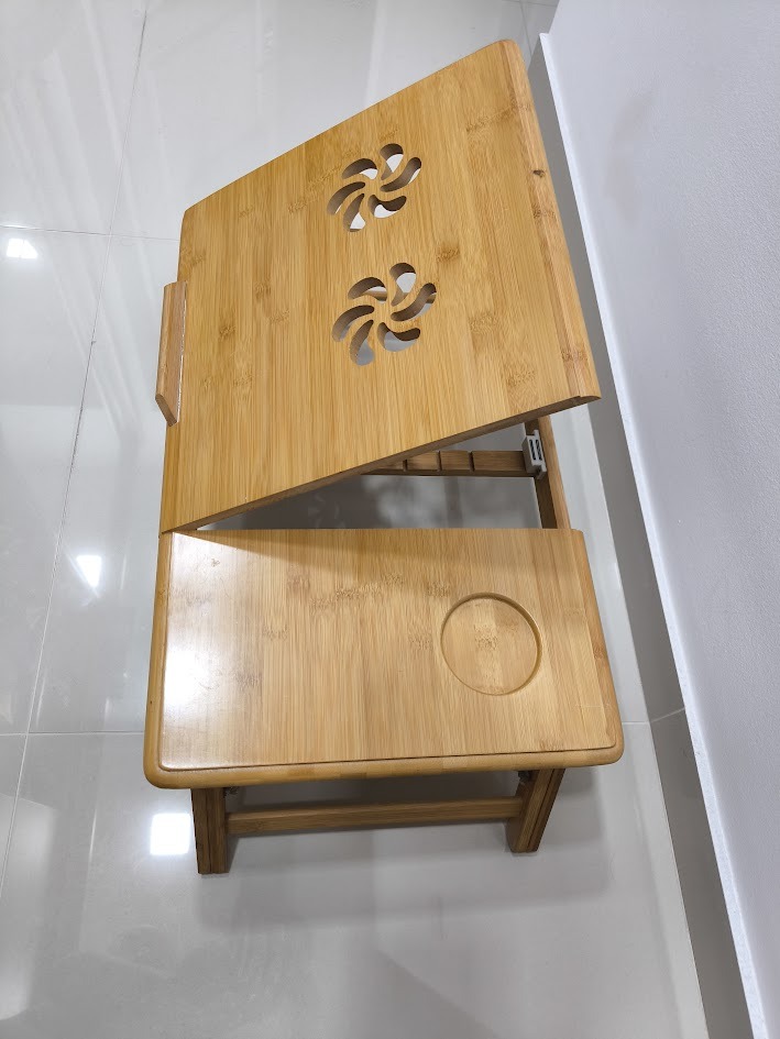 Eladó összecsukható asztal laptophoz, bambuszfából faragott kivitellel, állítható magassággal és munkaszöggel, egér- és fióktartóval. Mérete: 55x35 cm