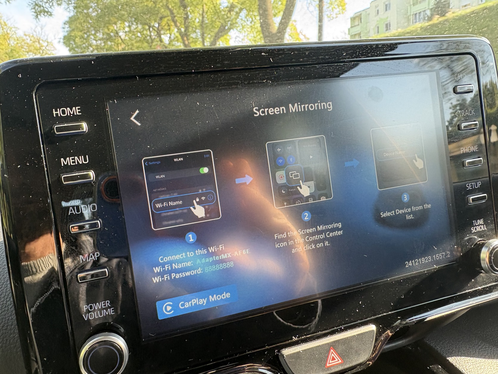 Alapértelmezetten a CarPlay/Android Auto indul el, de gombnyomással válthatsz AirPlay módba, ilyenkor vagy a teljes képernyőd képét, vagy csak egy adott képet/videót is kiküldhetsz rá.